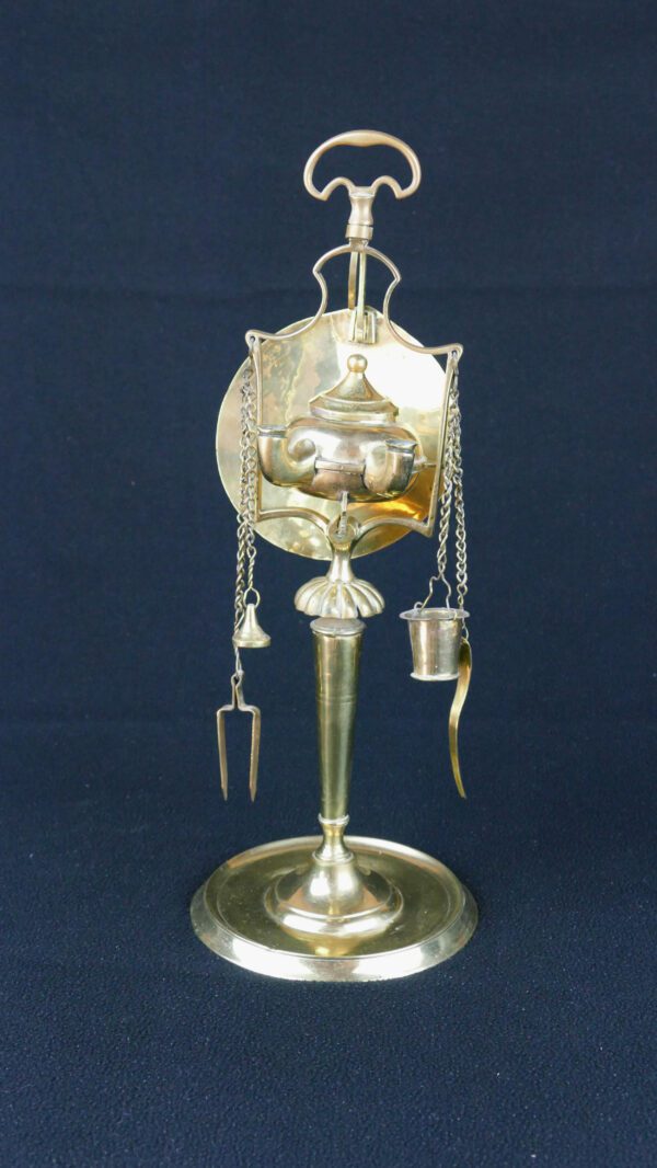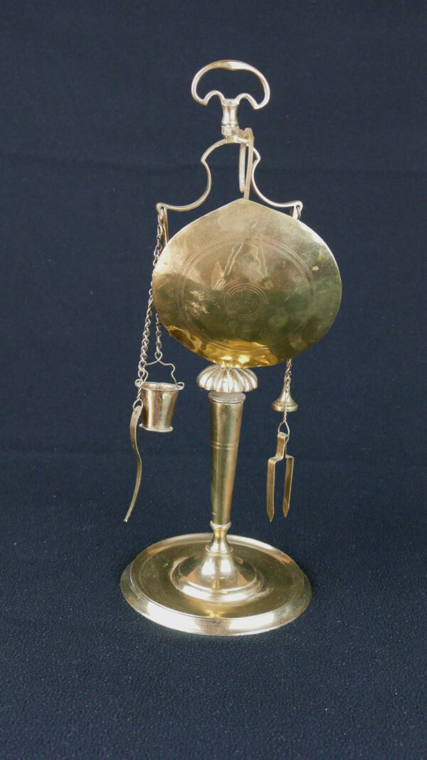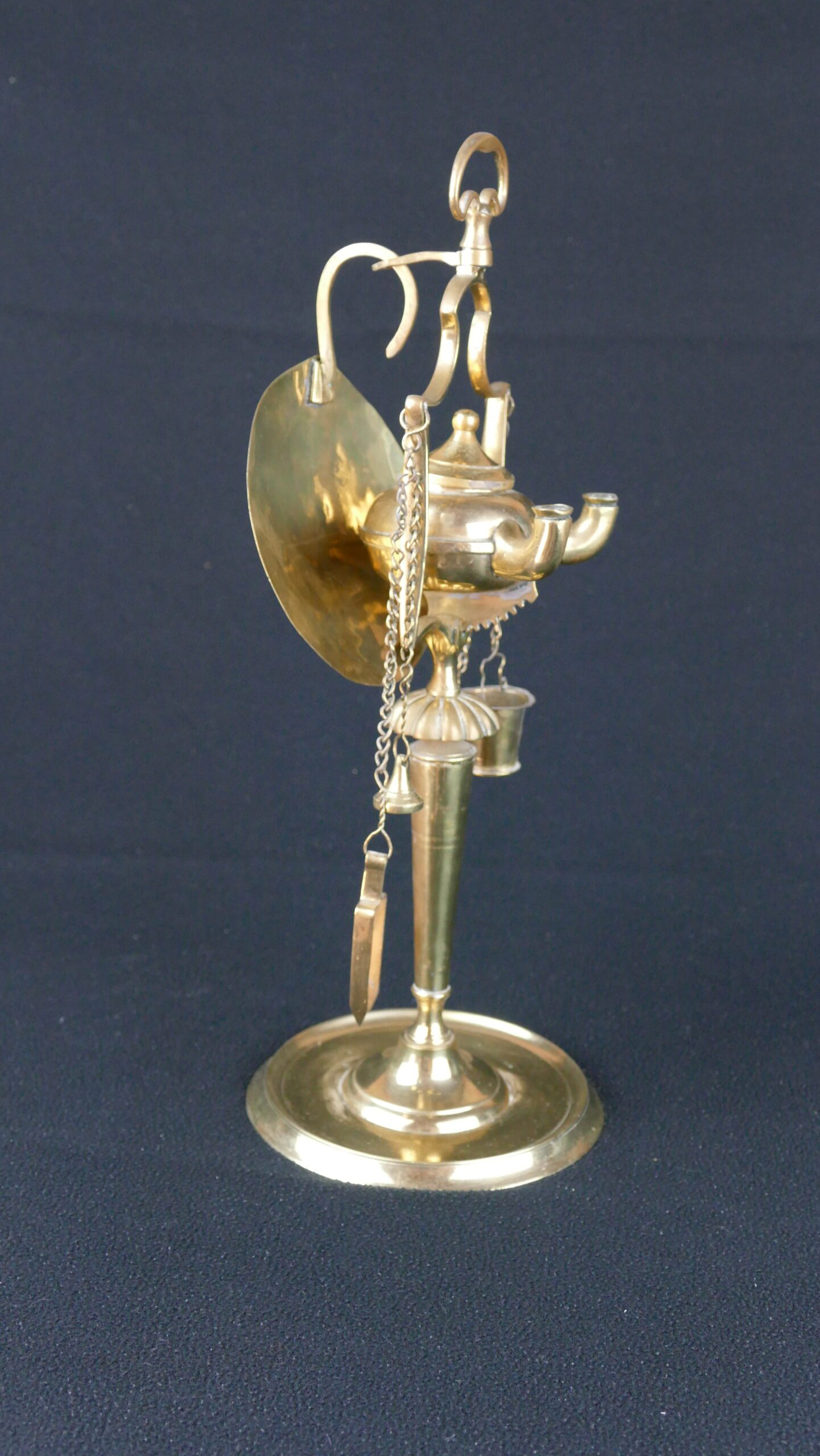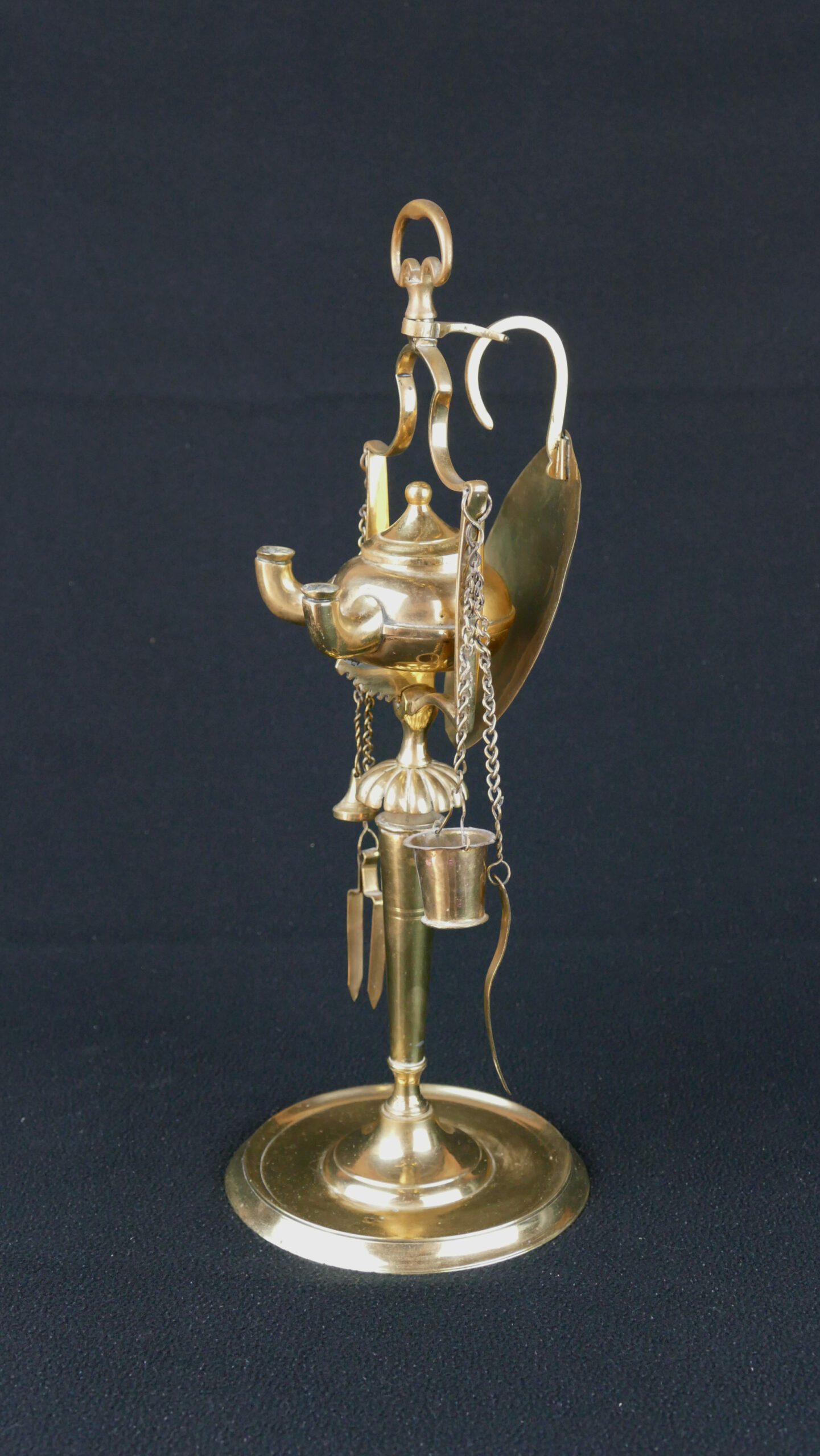 A particularly charming feature is the complete set of suspended tools on chains (snuffer/wick trimmer and other wick-maintenance implements), a practical detail that also gives the lamp its distinctive, “miniature workshop” silhouette.