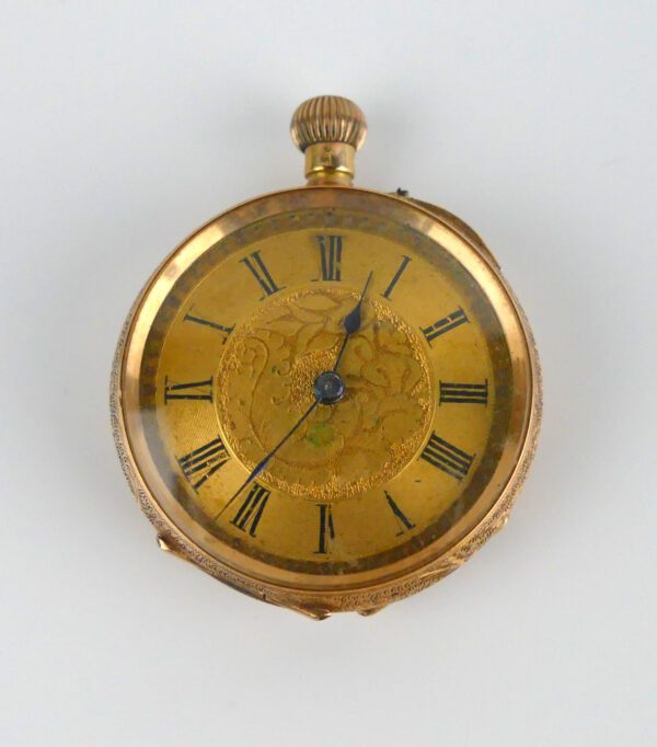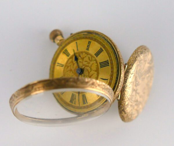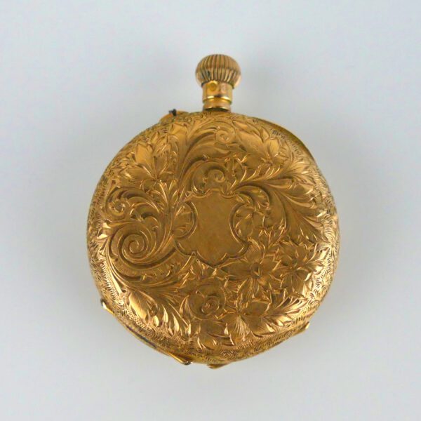 An elegant Victorian pocket (pendant) watch in solid gold with a richly engraved hunter-style case. The front cover opens to a golden dial with black Roman numerals and delicate floral engraving—classic late-19th-century taste. Compact at 30 mm, it wears beautifully on a chain or slips neatly into a small pocket.