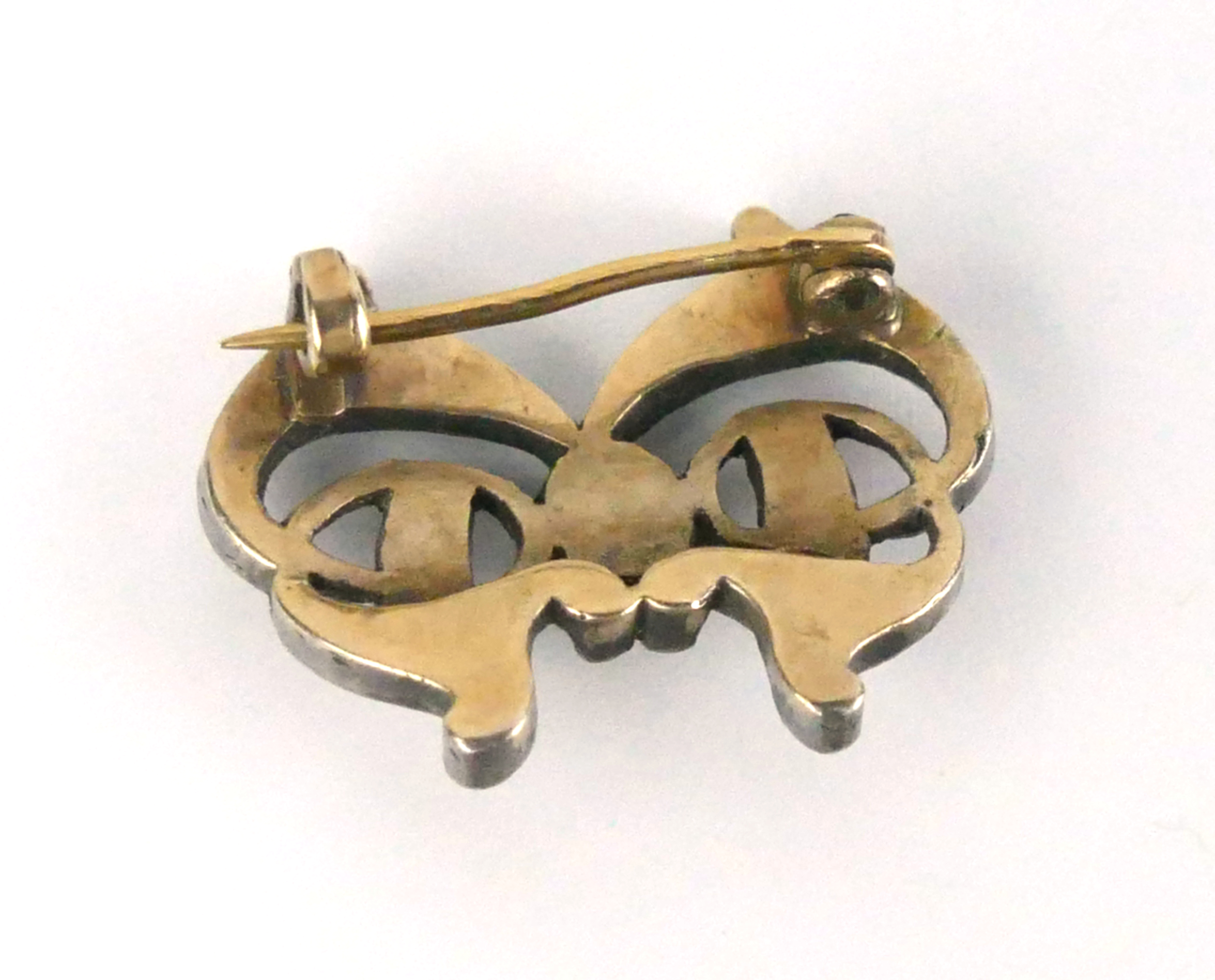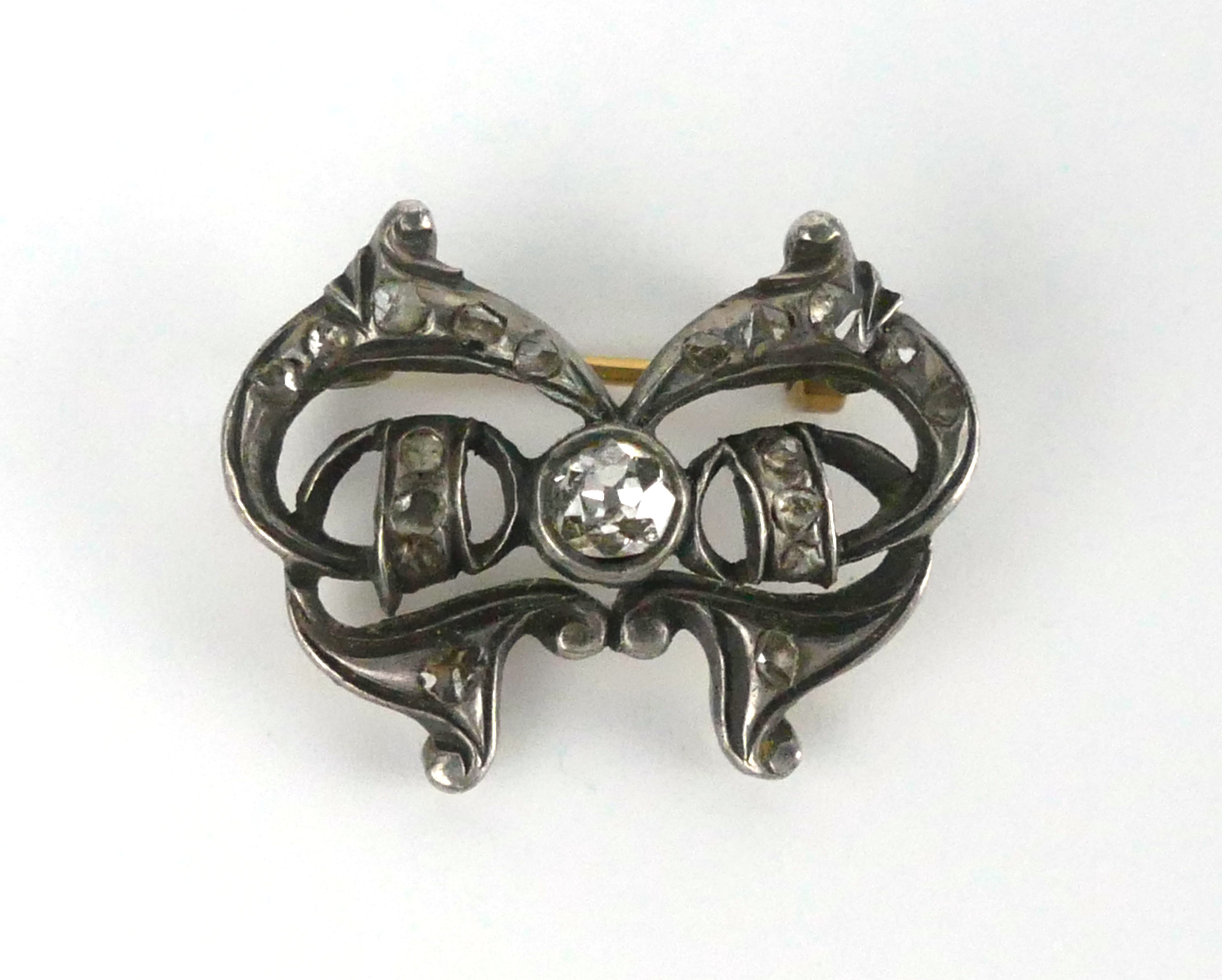 Elegant 18th-century style bow-shaped brooch, crafted in silver to the front and gold to the reverse, set with nineteen diamonds. It features one central good quality diamond (4 mm) and eighteen smaller diamonds (1 mm each), creating a refined sparkle.