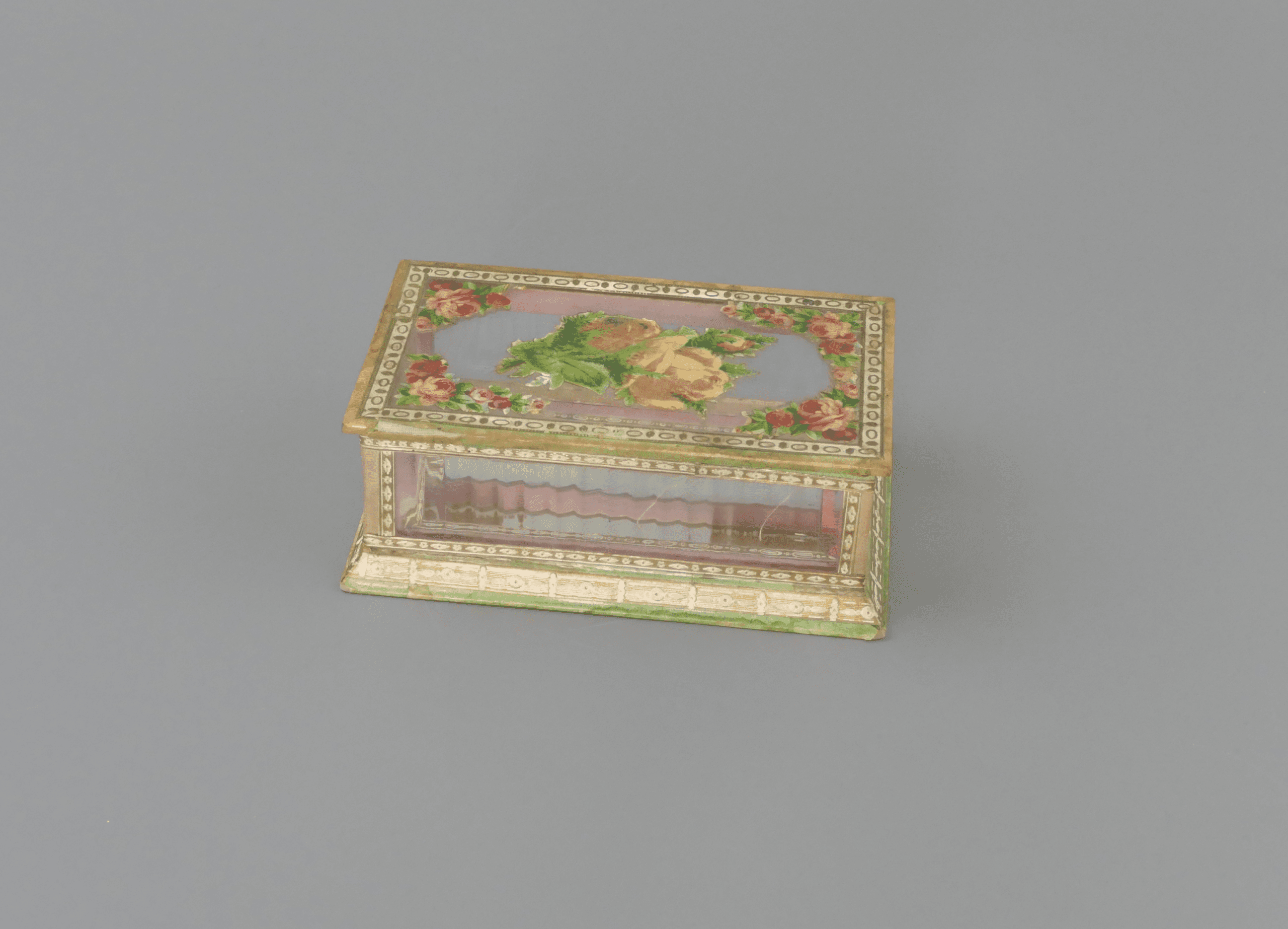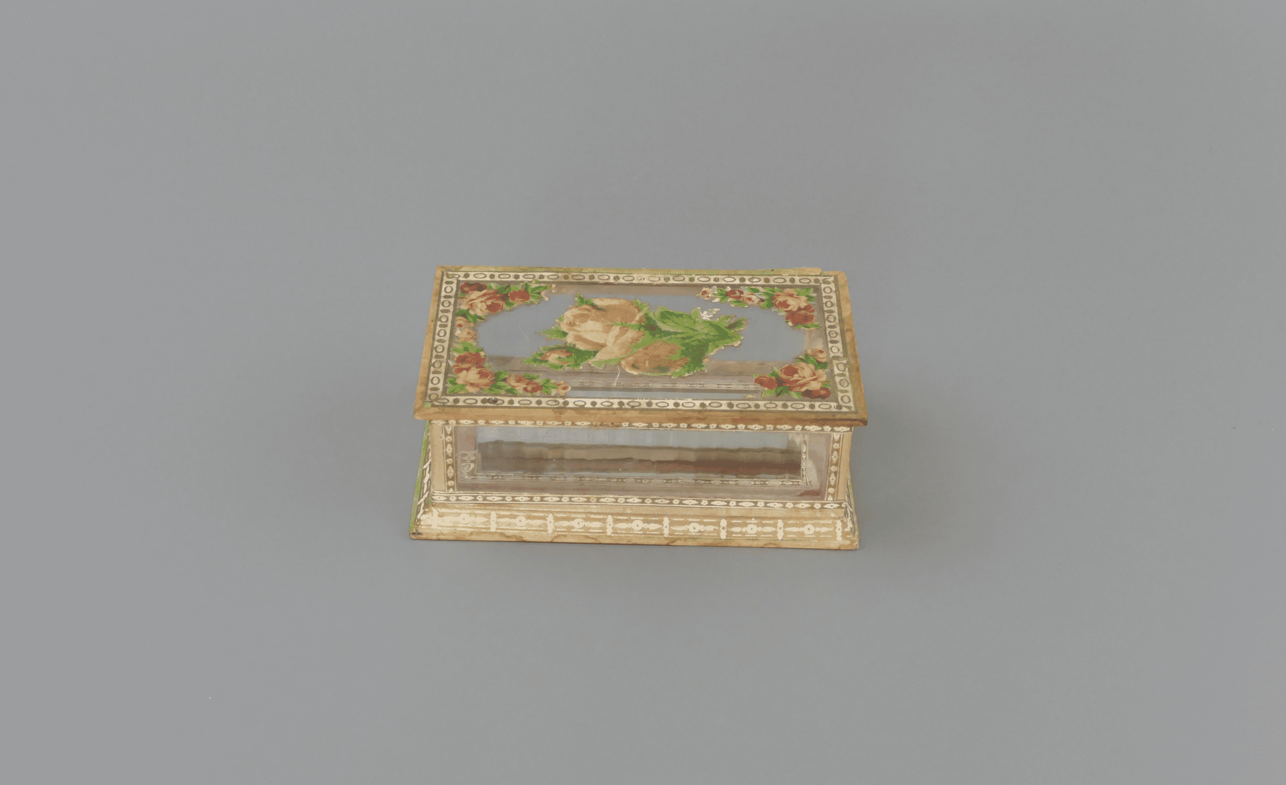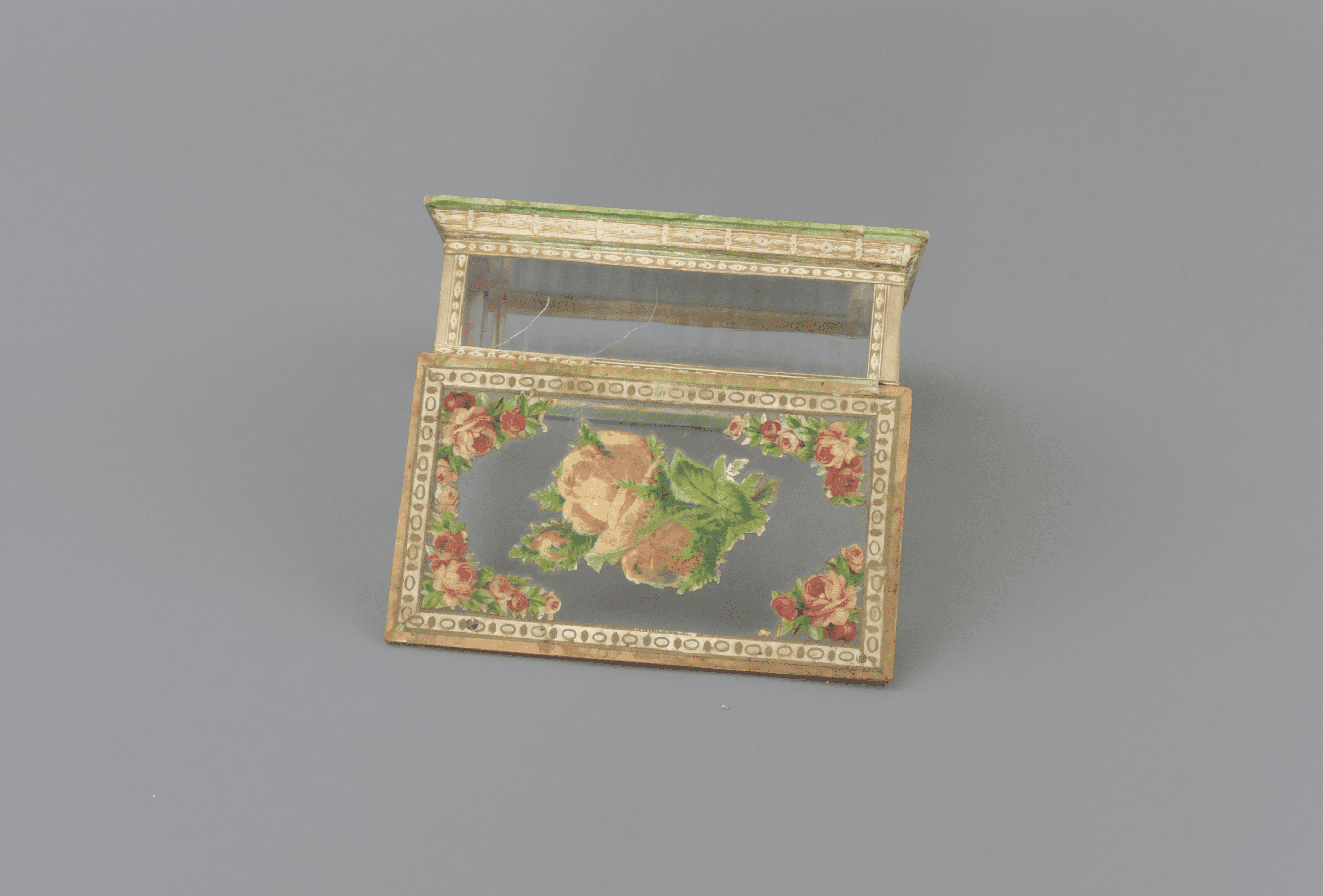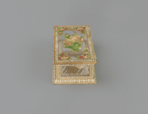 This is a beautiful antique glass trinket box, crafted from wood, paper and glass panels with a mirrored base and delicate floral collages, accented with gilt painting and detail. The box displays a wonderfully nostalgic aesthetic, typical of late 19th to early 20th‑century decorative items. It shows gentle signs of age and use, adding character without detracting from its overall appeal. The floral motifs and mirror detail would have originally made this a decorative object for a dressing table or cabinet. A lovely heirloom‑quality piece for collectors of antique decorative objects.