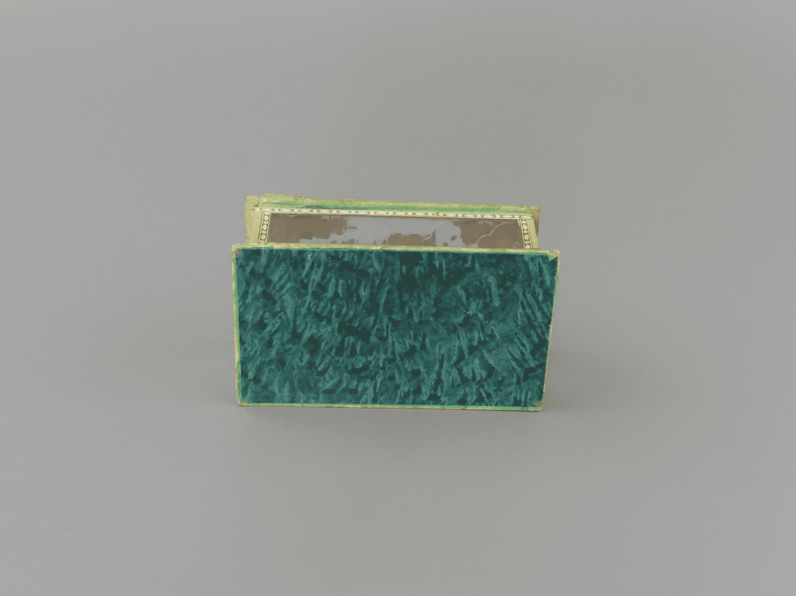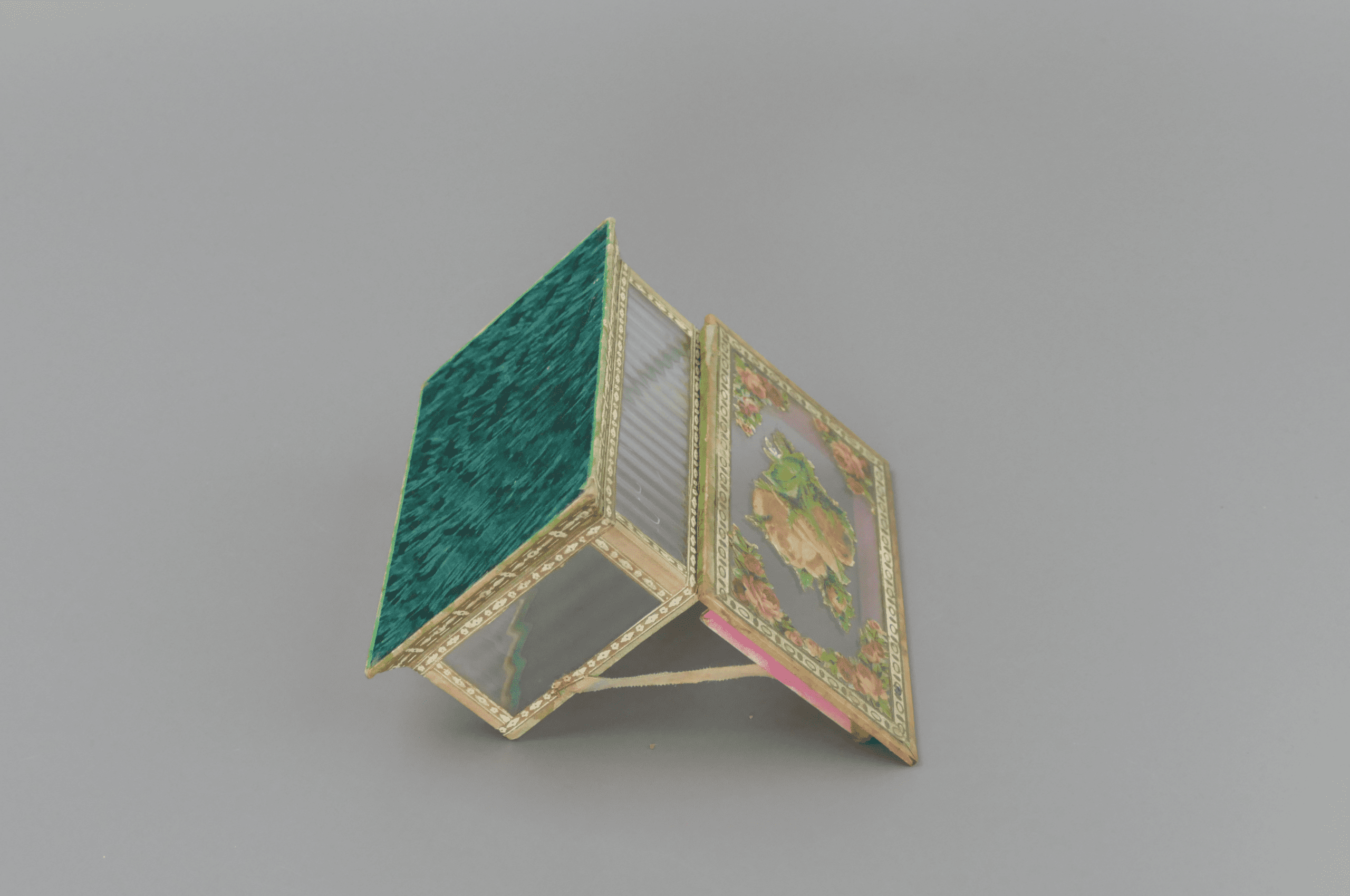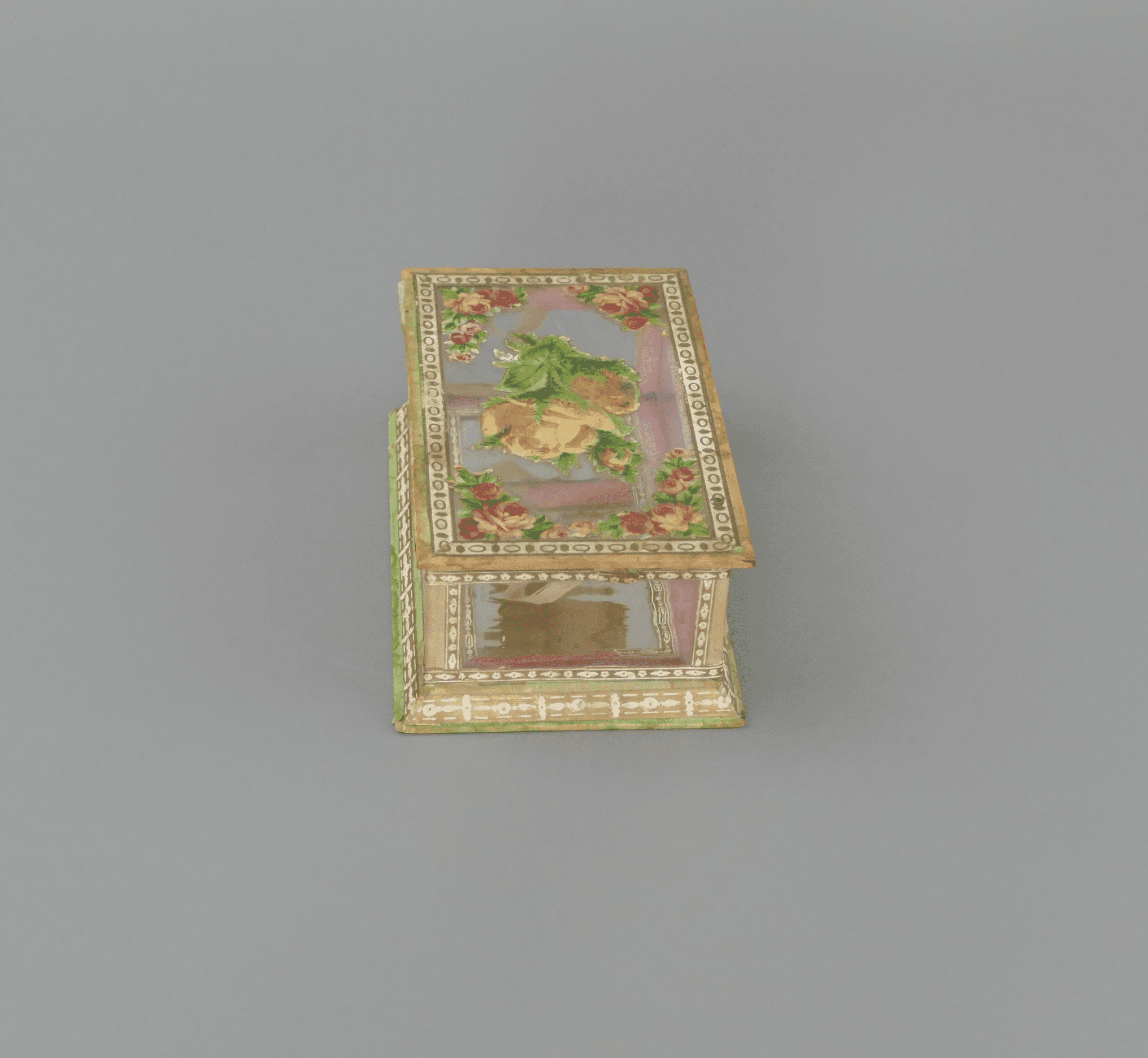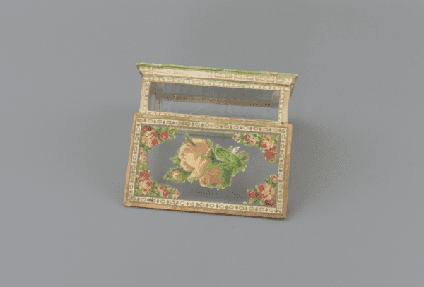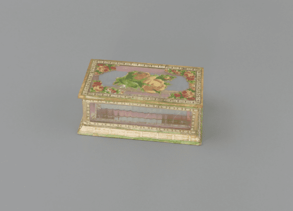 This is a beautiful antique glass trinket box, crafted from wood, paper and glass panels with a mirrored base and delicate floral collages, accented with gilt painting and detail. The box displays a wonderfully nostalgic aesthetic, typical of late 19th to early 20th‑century decorative items. It shows gentle signs of age and use, adding character without detracting from its overall appeal. The floral motifs and mirror detail would have originally made this a decorative object for a dressing table or cabinet. A lovely heirloom‑quality piece for collectors of antique decorative objects.