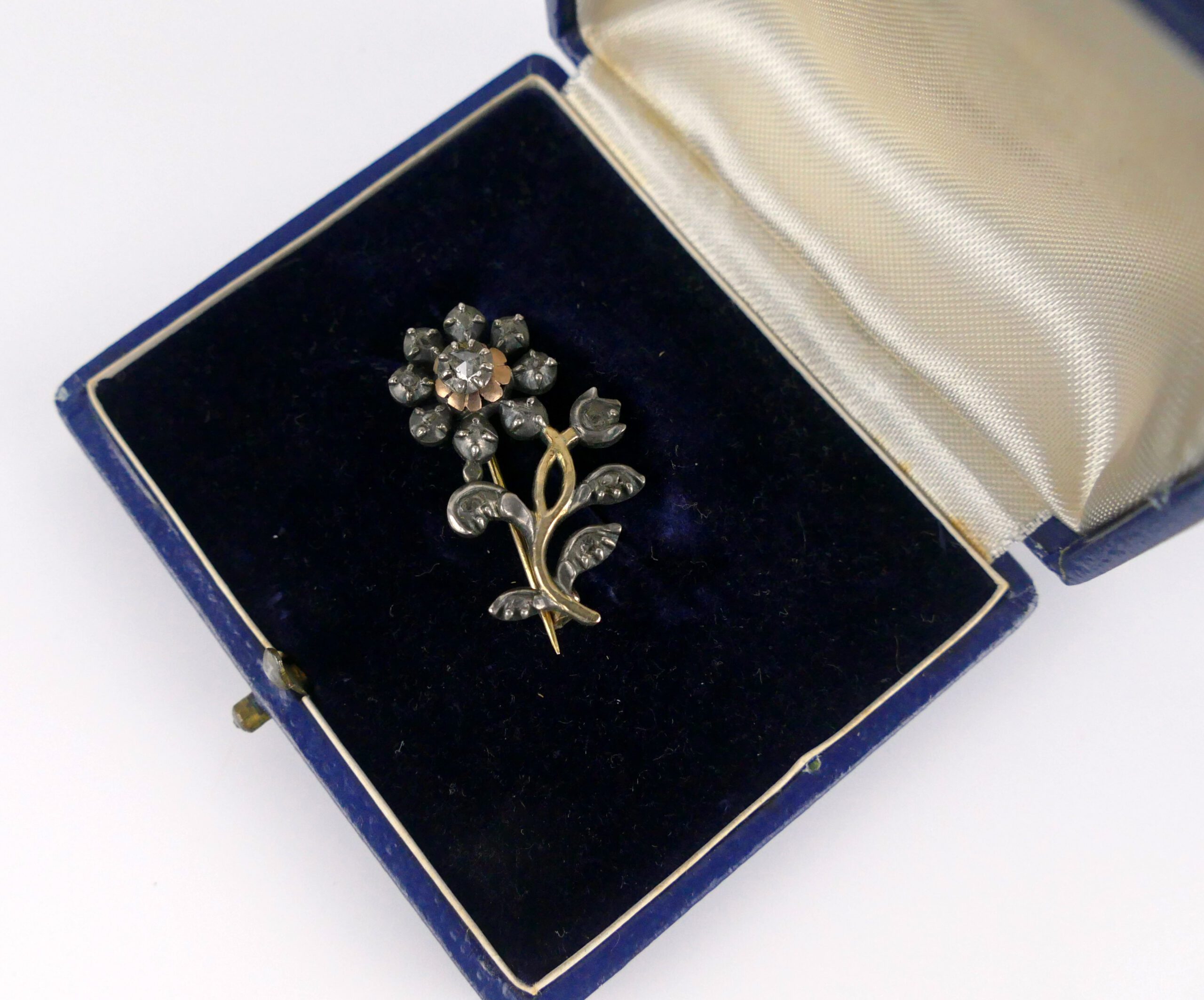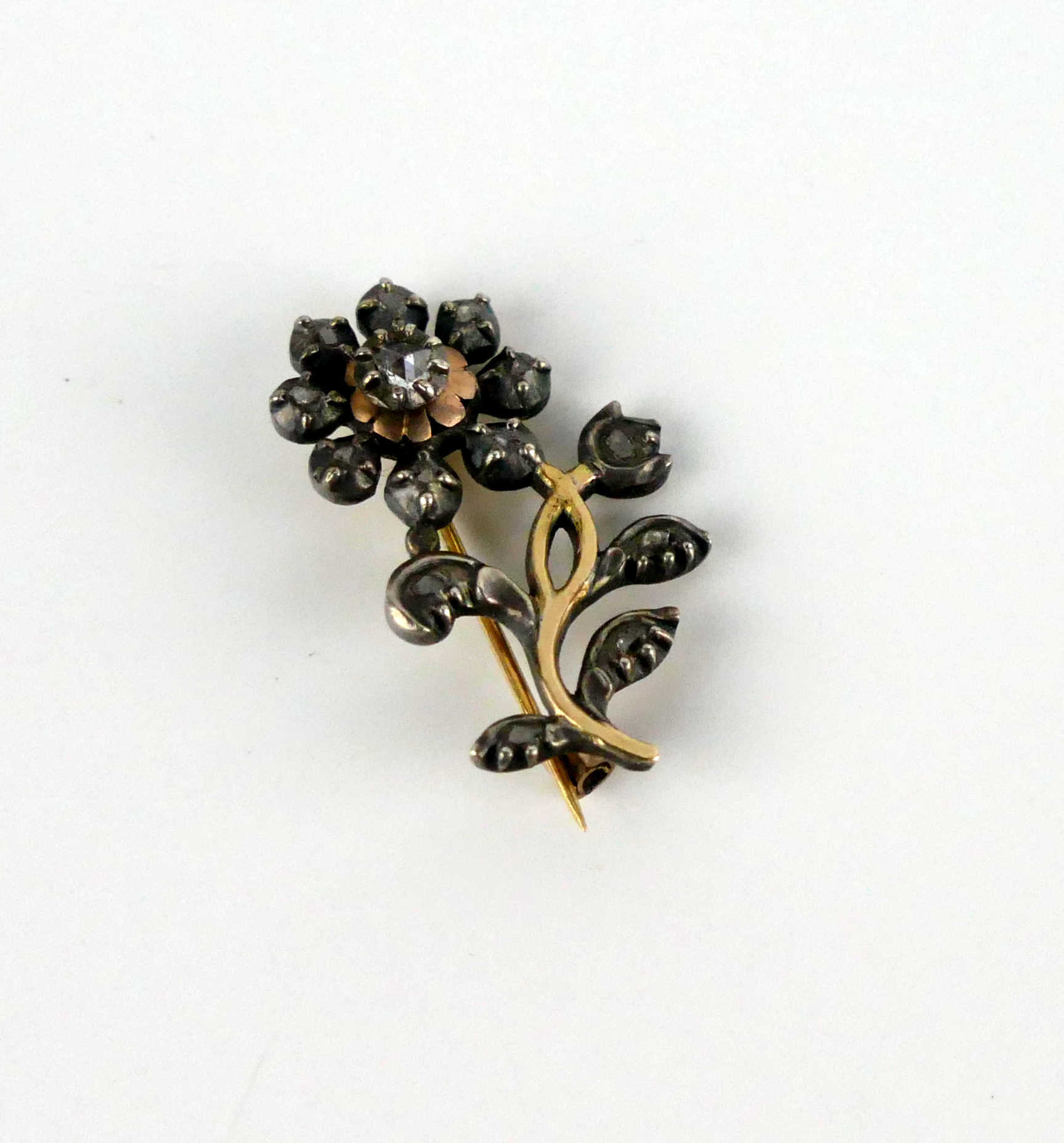 A refined antique medallion brooch in the classic silver-fronted, gold-backed construction. The design is arranged in delicate scrolls and rosettes and set with 14 stones: one approx. 3 mm, twelve approx. 1 mm (plus a tiny accent).