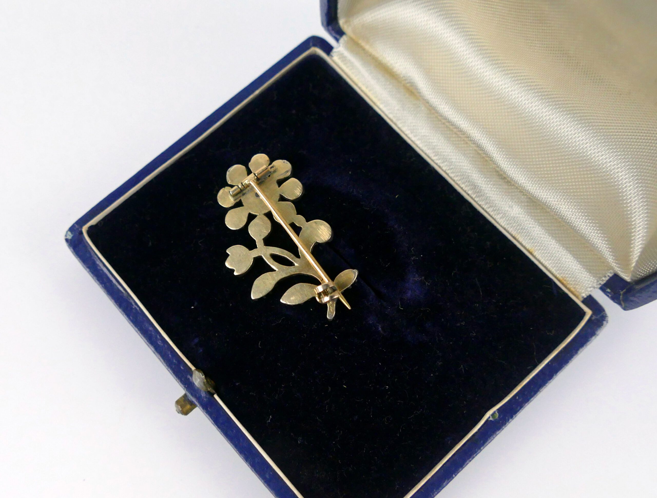 The stones did not test as diamond at a jeweller, which is common in antique pieces where white pastes/rock crystal/white sapphire were used to emulate diamonds. Given the age and workmanship, the brooch remains a high-quality jewel with beautiful period sparkle. Unmarked, excellent condition.