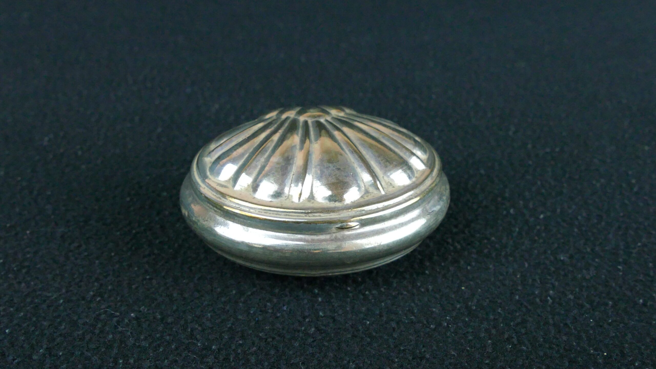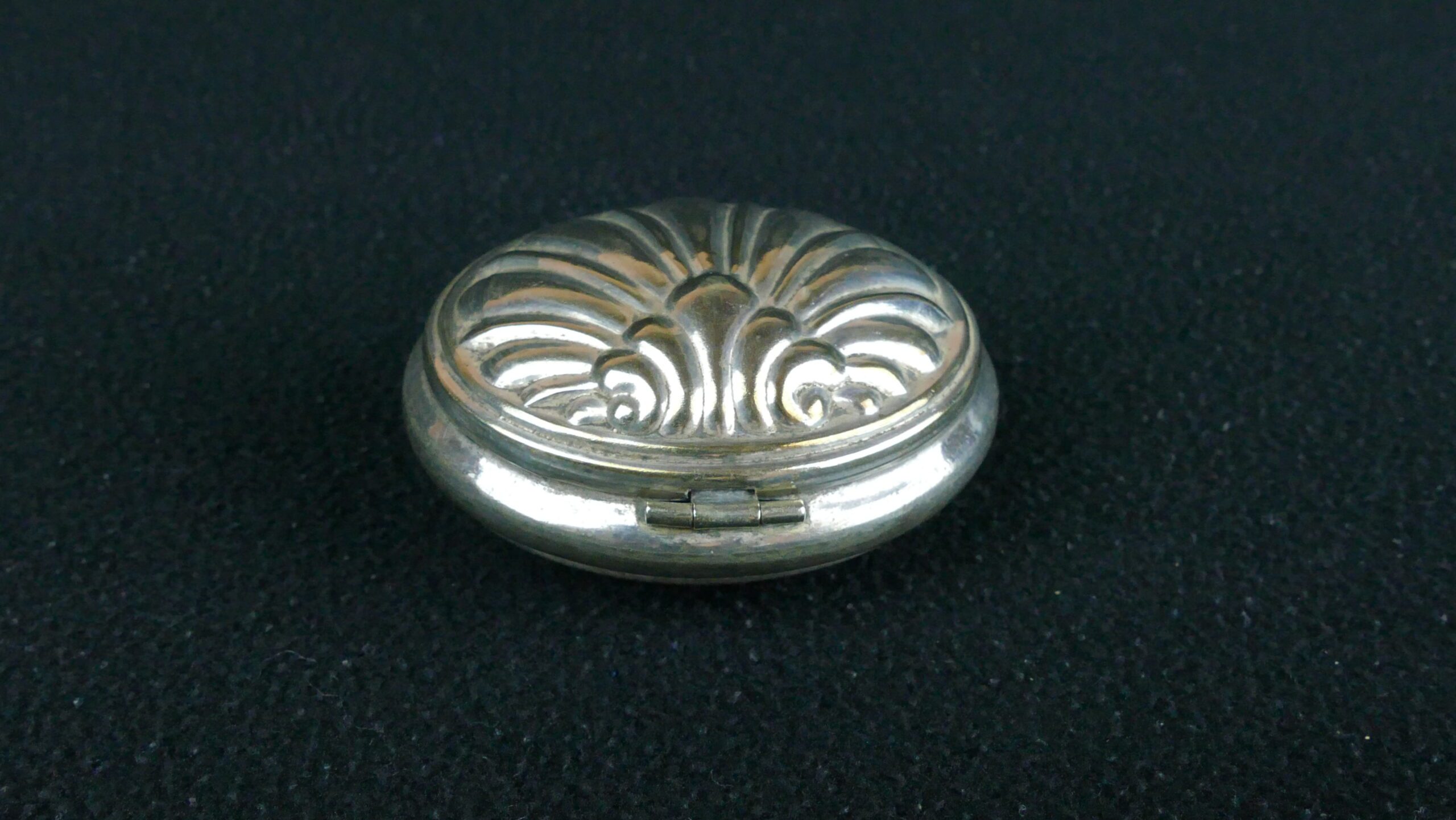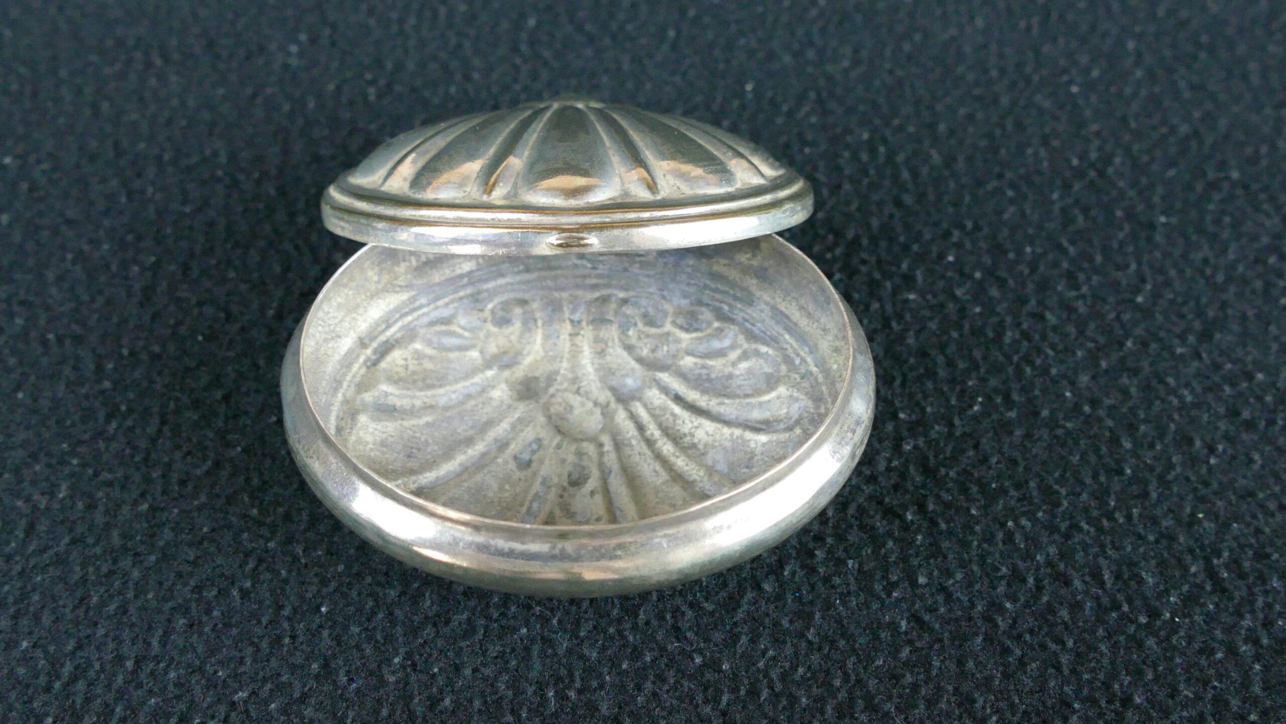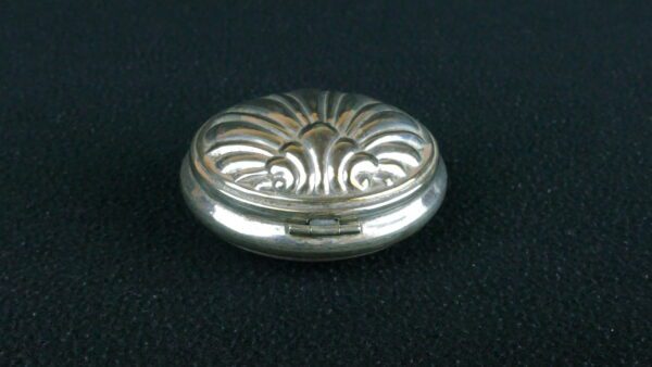 A charming antique shell-form box in silver-toned metal, likely silver-plated, with a gently domed lid and attractive shell-inspired decoration. Small in scale and full of character, this is a decorative and collectable piece sourced from the manor house, with the quiet elegance of a personal object from another era. Its aged surface and soft patina enhance its authentic antique appeal.