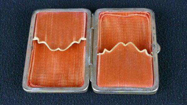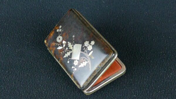 Antique genuine tortoiseshell cigarette case with silver floral inlay and silk-lined interior, likely dating to the early 20th century.