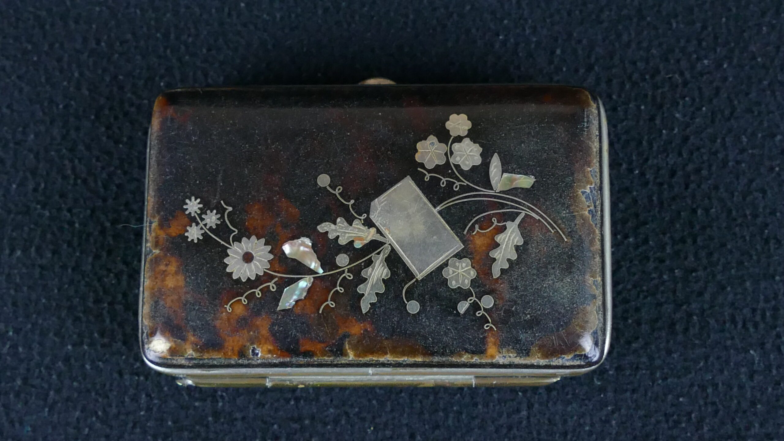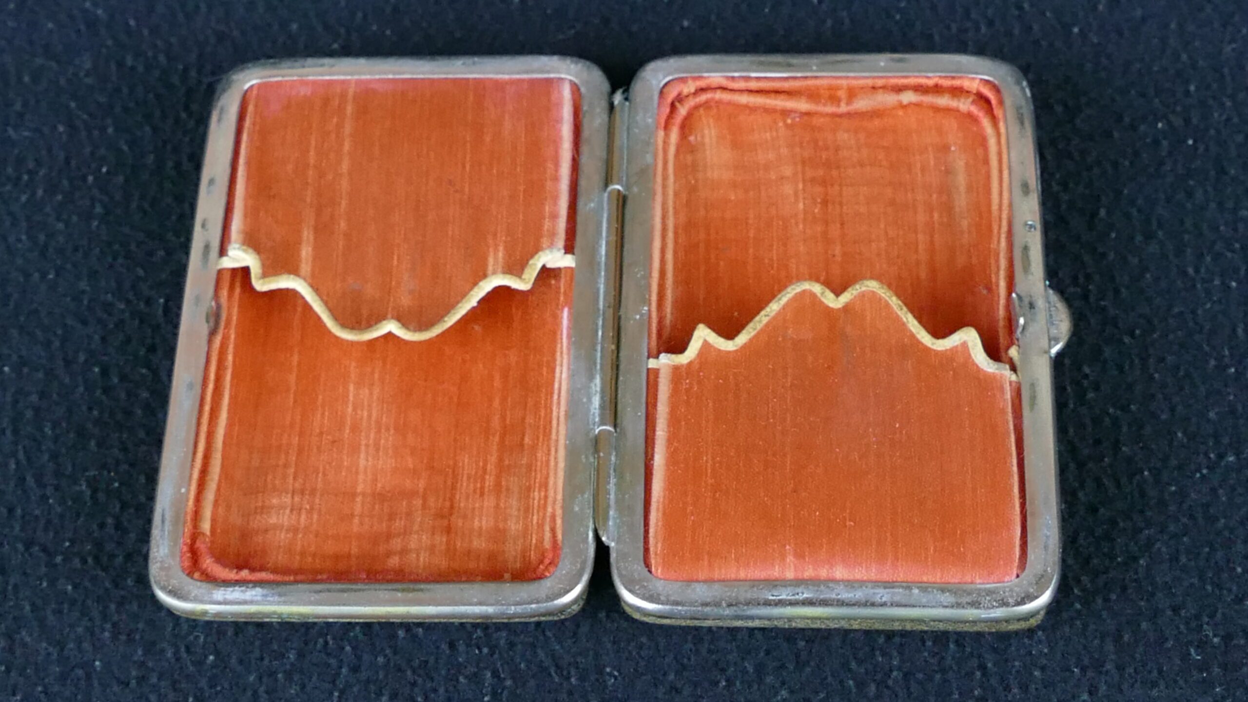 A refined antique cigarette case in genuine tortoiseshell, delicately inlaid with silver in an elegant floral design. Most likely dating from the early 20th century, this piece reflects the graceful decorative taste of the Art Nouveau and Edwardian period. The case opens to a silk-lined interior and retains the charm and quiet sophistication of a personal luxury object from another age. Sourced from a Portuguese manor house, it shows age-related wear consistent with its history, which only adds to its authenticity and character. A rare and beautifully decorative collector’s piece, equally appealing for a cabinet of curiosities or a thoughtfully layered interior.