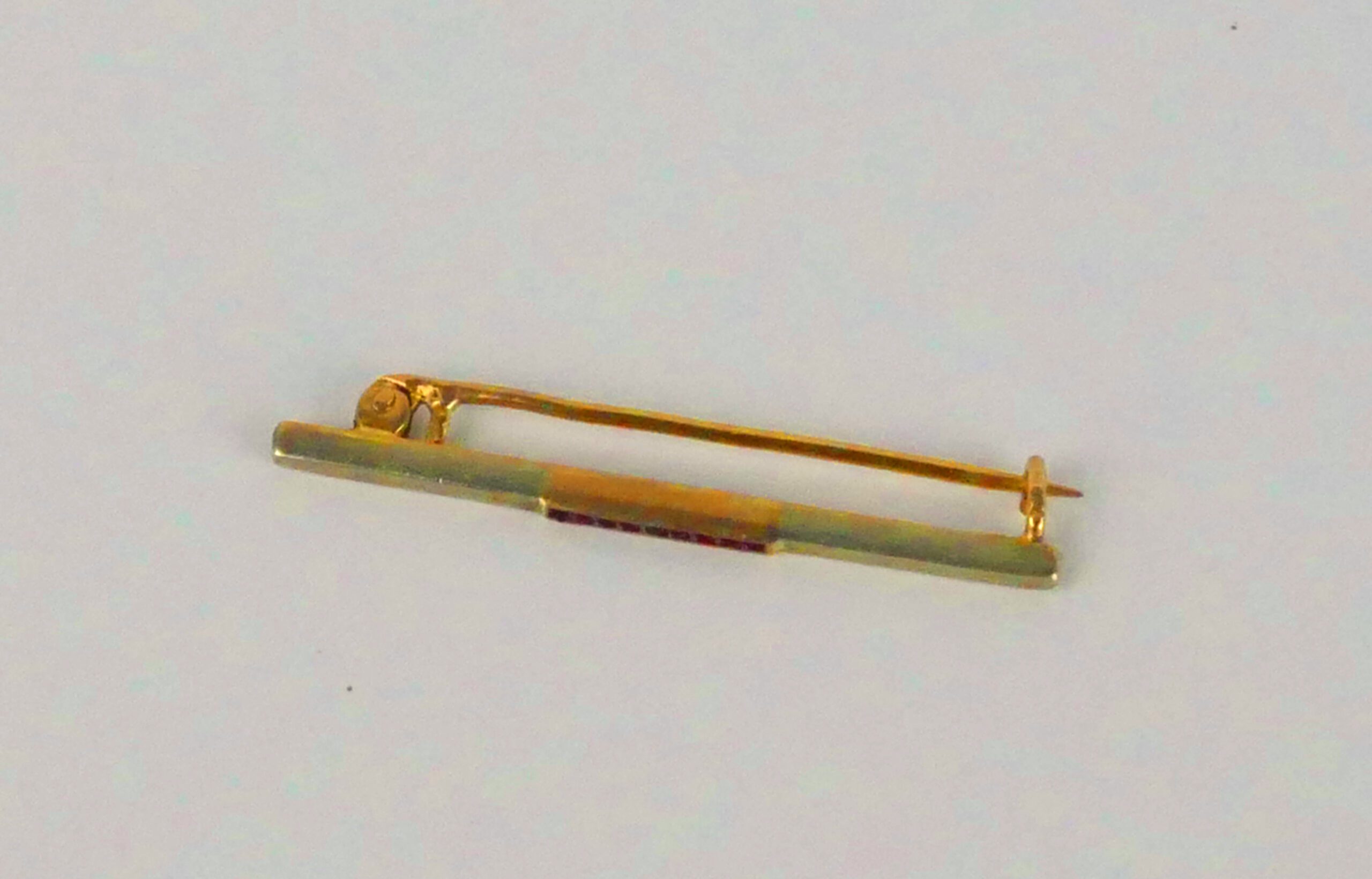 Discover a refined and charming antique brooch from the turn of the century (c. 1900), crafted in fine gold with a silver‑front and set with nine hand‑cut square rubies. Measuring just over 3 cm in length and weighing approx. 1 g, this slim bar‑style brooch was once designed as a child’s tie‑pin, yet today unfurls its quiet elegance onto a lapel, a collar, or as a subtle pendant.