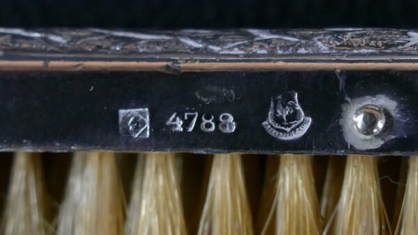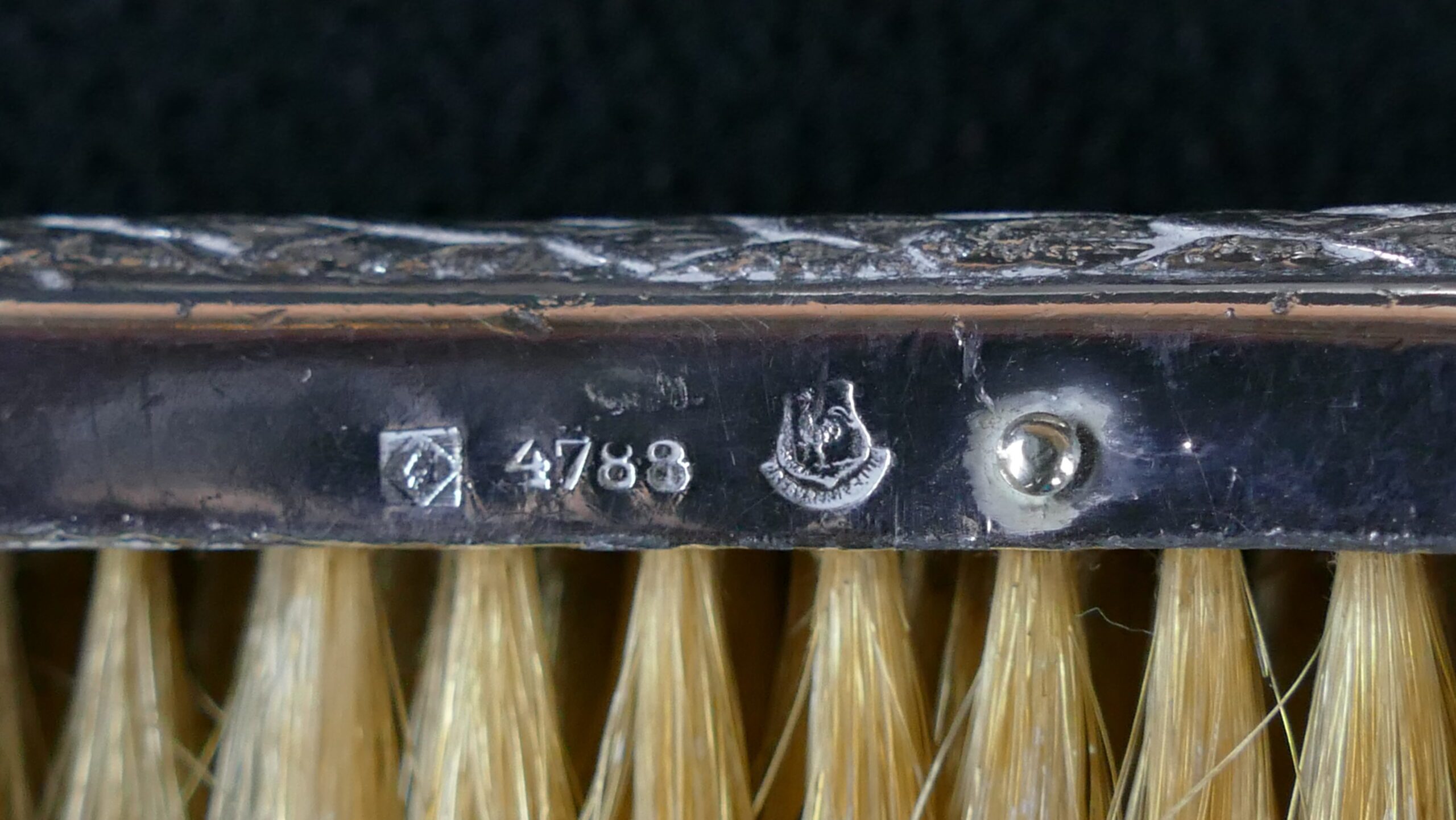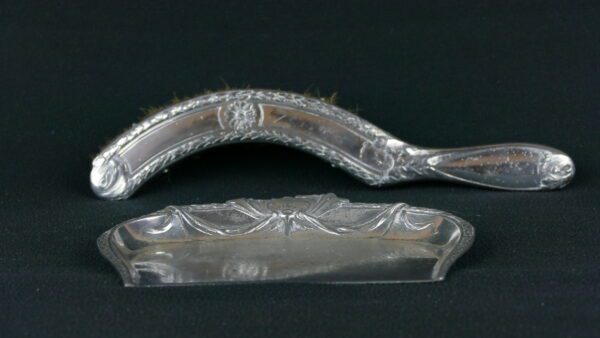The brush is hallmarked (see photos) and presents as silver. The tray has no visible hallmark and may be base metal with a silver-plated finish; it is priced and described accordingly.