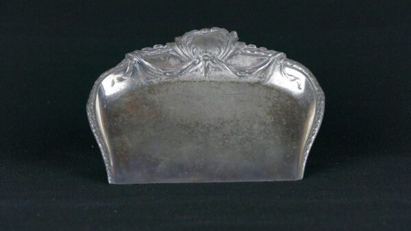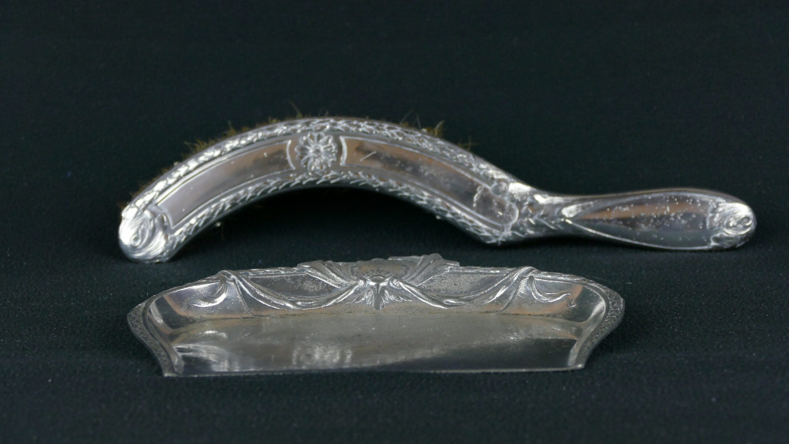An elegant table accessory from a Portuguese manor house: a crumb brush and tray set with Art Nouveau vegetal relief, traditionally used to sweep crumbs from fine linen between courses.