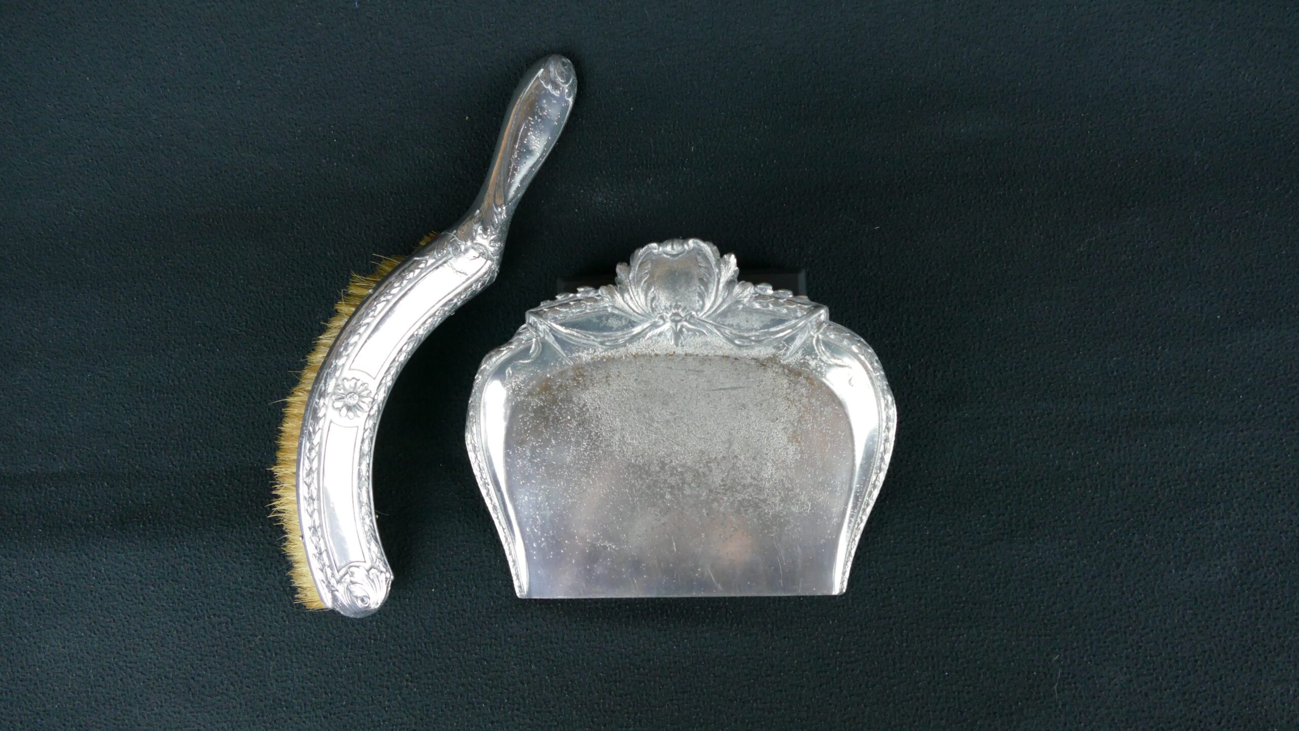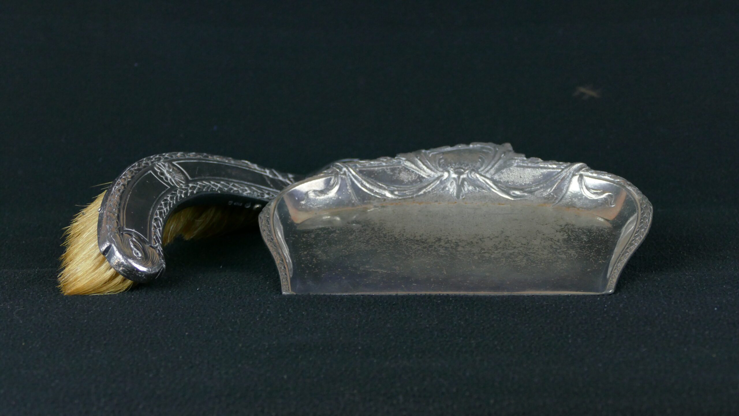 Art Nouveau crumb brush and tray from a Portuguese manor house. Hallmarked brush (252 g); tray unmarked and possibly silver-plated metal. Total weight 0.336 kg, with honest age patina.