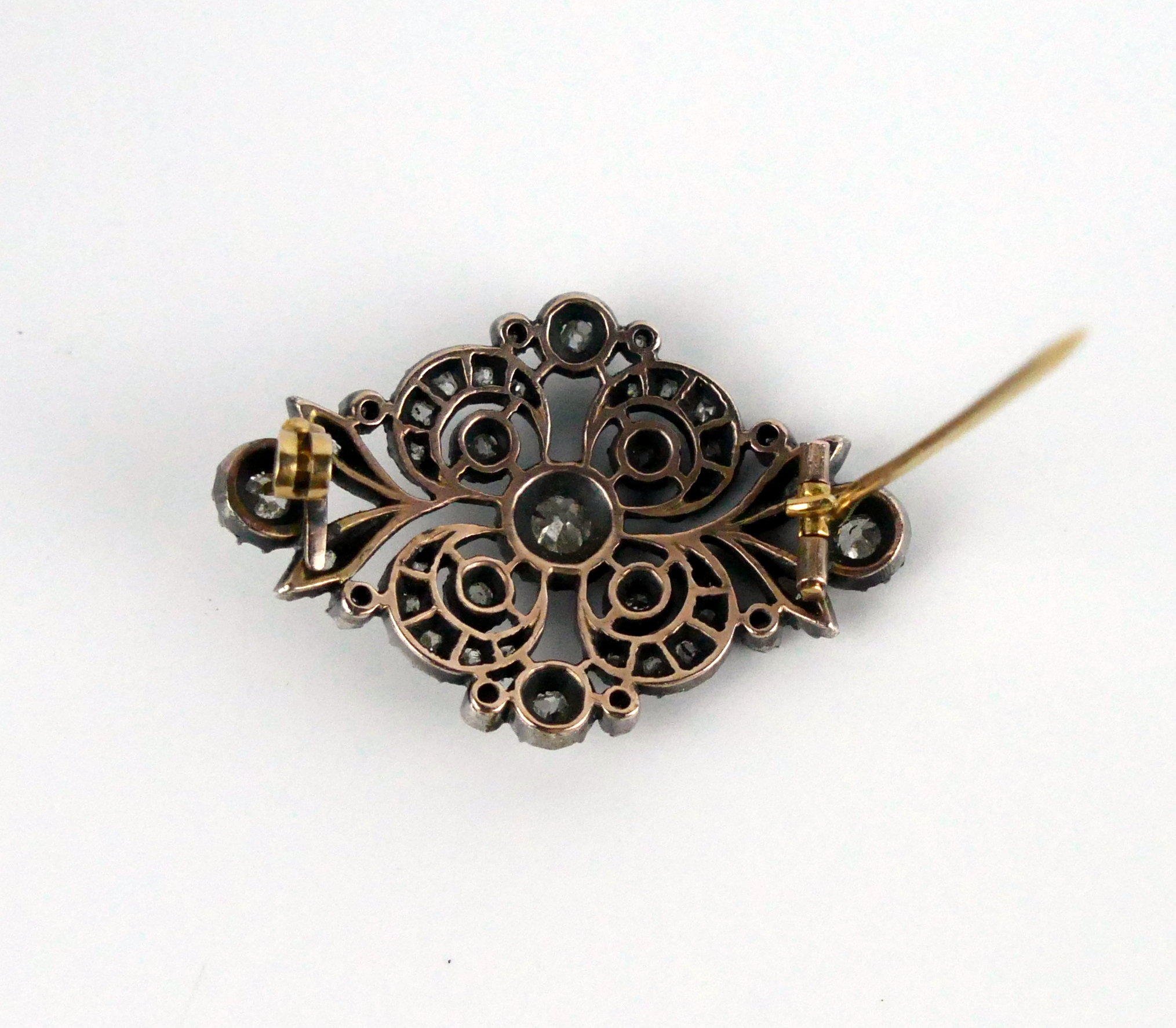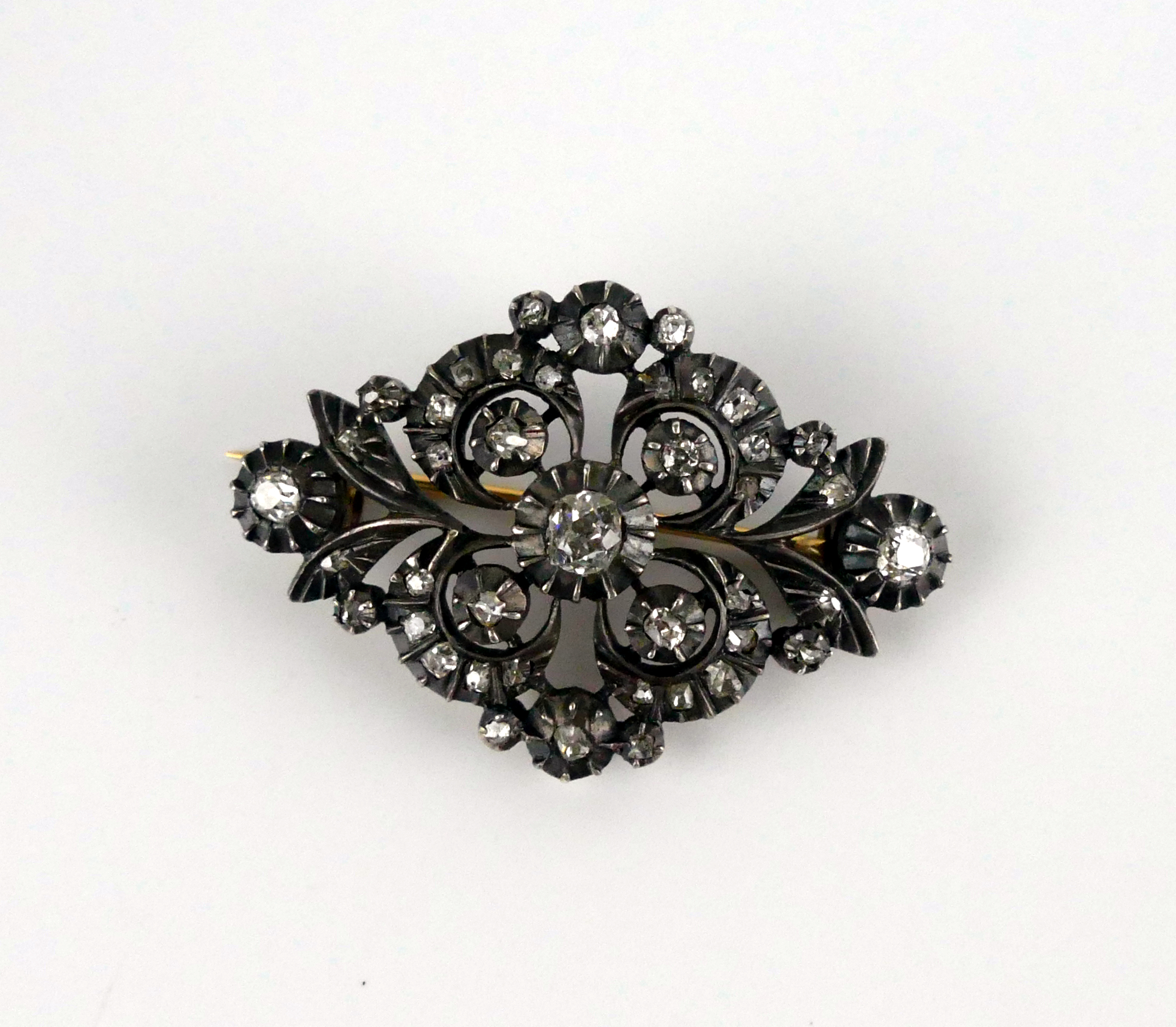 Refined 18th-century medallion brooch in silver-fronted, gold-backed construction (the classic silver-topped-gold of the period). The jewel is pavé-set with 41 stones arranged in scrolling foliage and rosettes. The centre stone (~5 mm) tests as moissanite—almost certainly a later replacement—while the surrounding stones are diamonds in mixed early cuts: 2 × 3 mm, 6 × 2 mm, 32 × 1 mm.