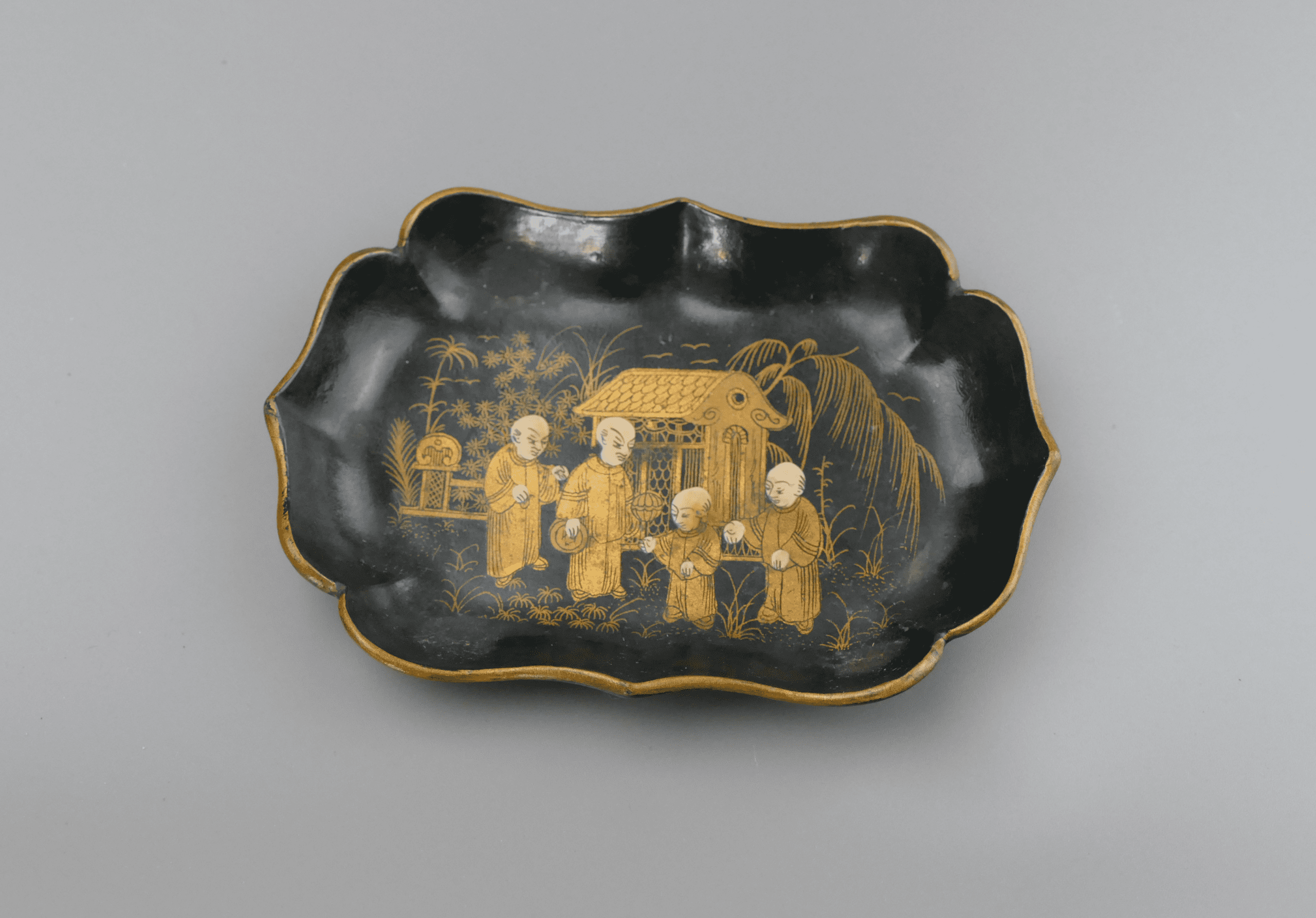 Elegant and compact, this Japanese black lacquer ashtray is hand-decorated in gold with a scene of daily life—rich in detail against a deep, glossy ground. Pieces like this are often associated with maki-e style lacquer decoration, prized for the way gold motifs seem to float over the dark surface.