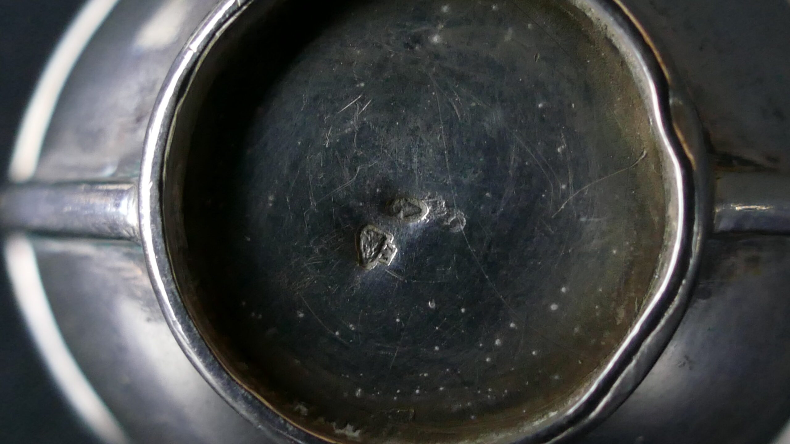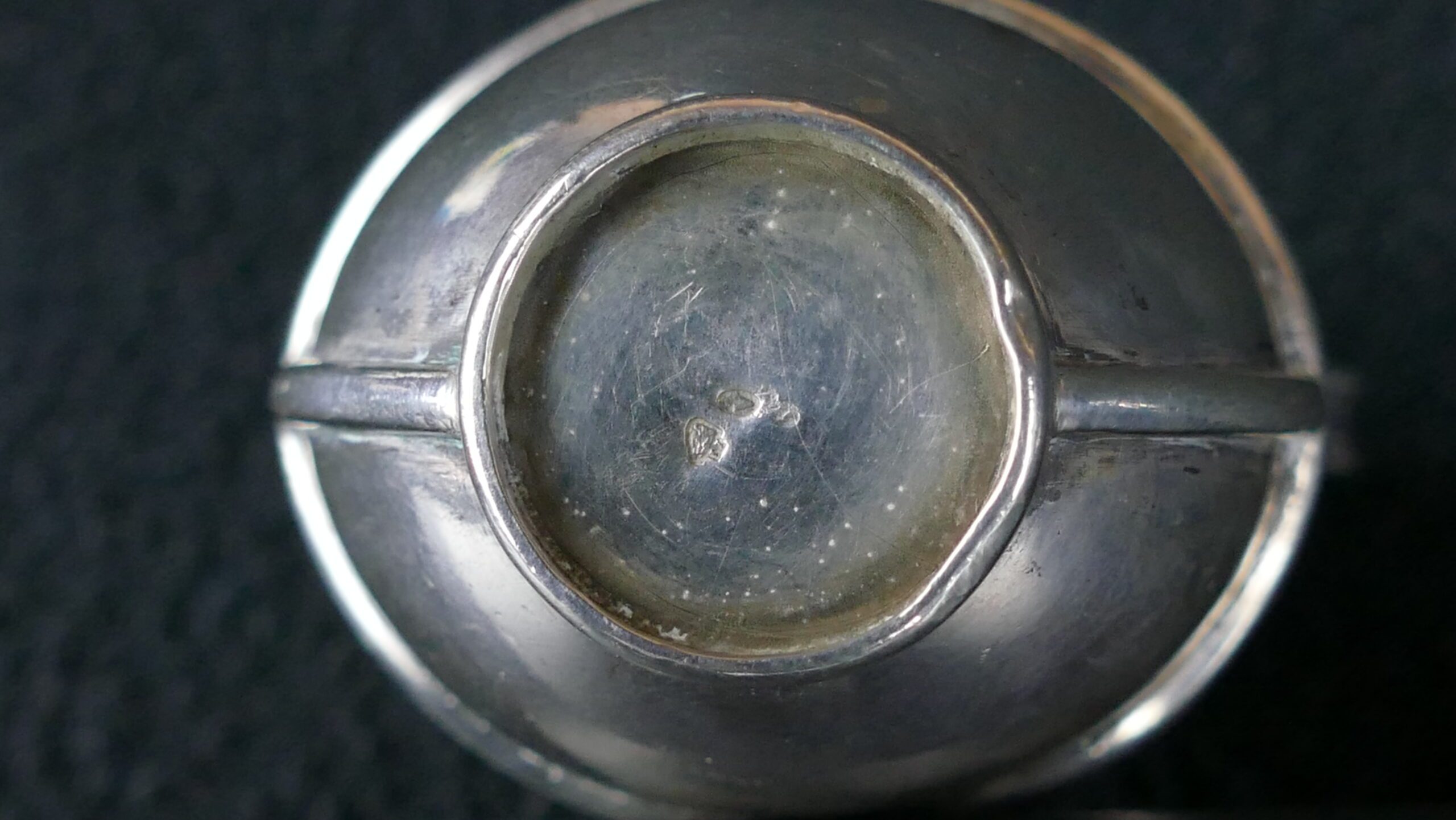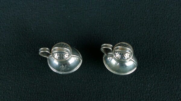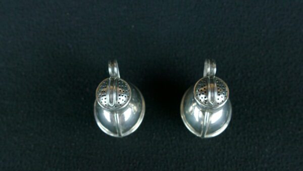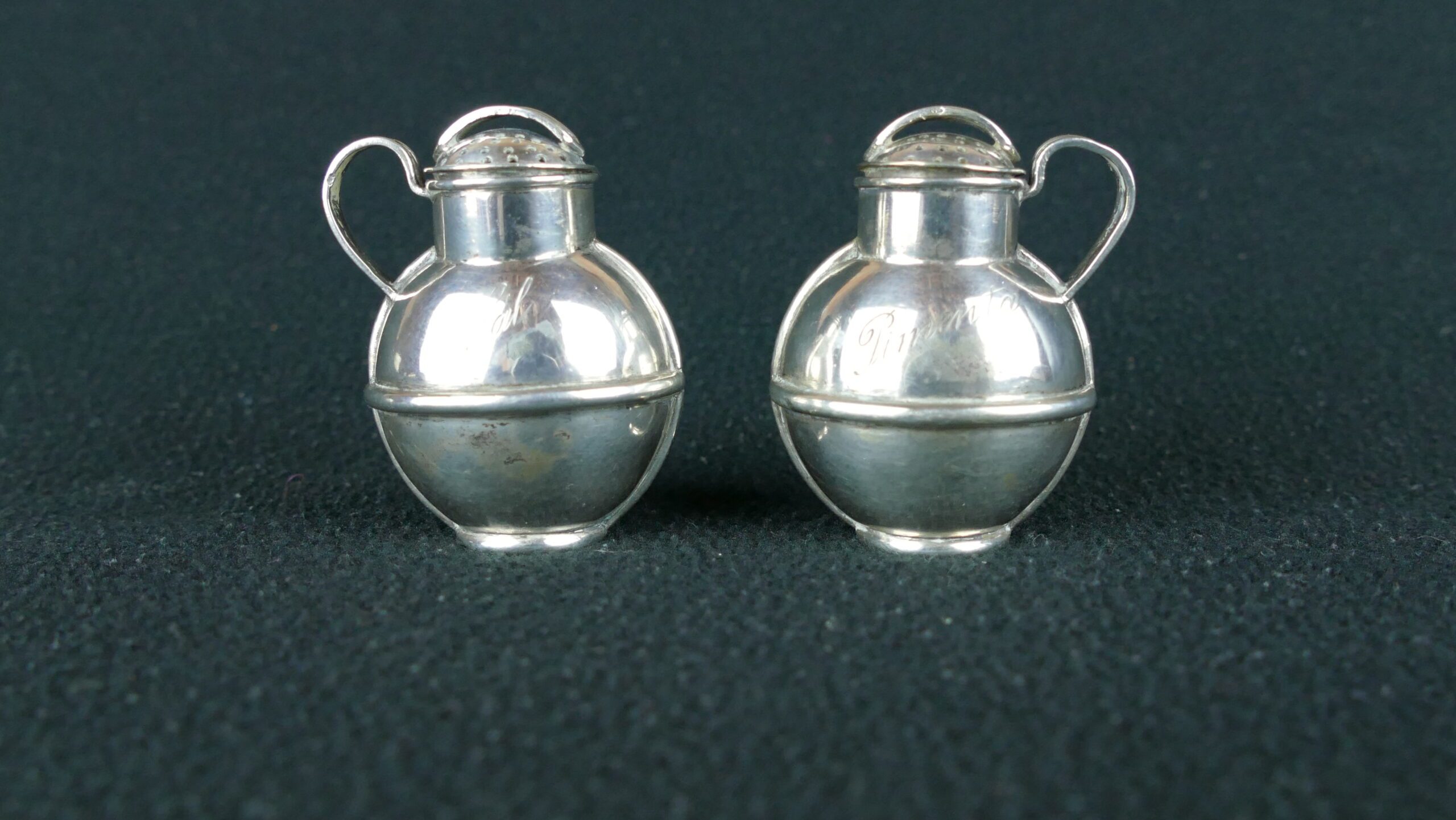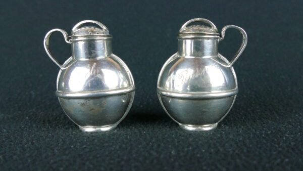 Delightful miniature salt and pepper shakers in hallmarked Portuguese silver, each with a graceful loop handle and a pierced dome lid. Their rounded, almost amphora-like silhouette feels wonderfully traditional—small-scale tableware made to bring a touch of ceremony to everyday dining.