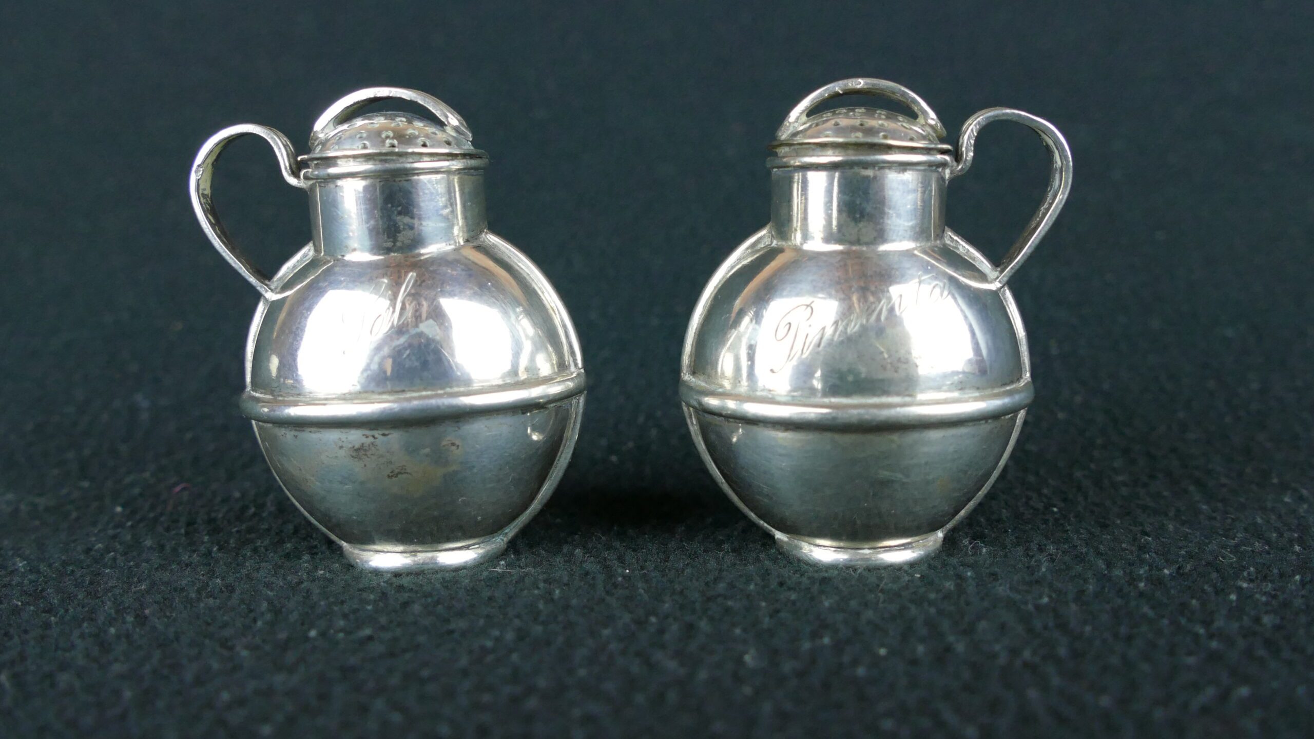 Light signs of age and use, including small surface marks/scratches. One shaker shows a small dent to the base. Overall, the pair presents well and remains in good condition for its age.