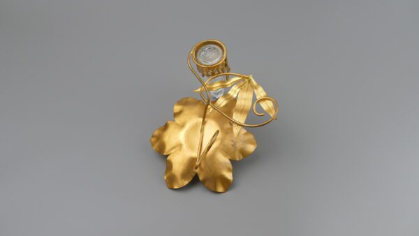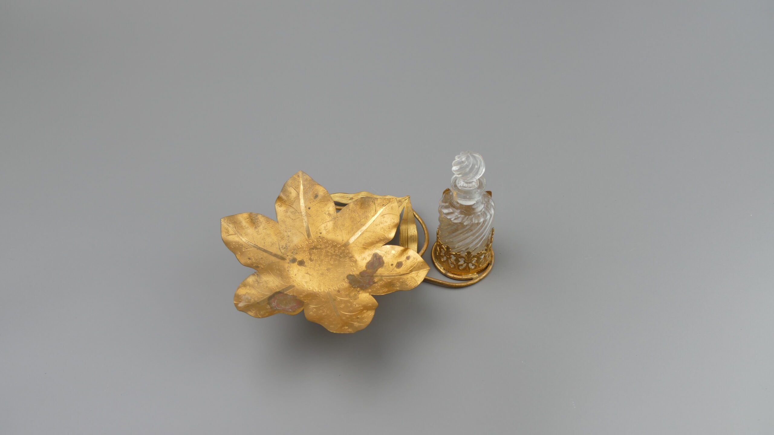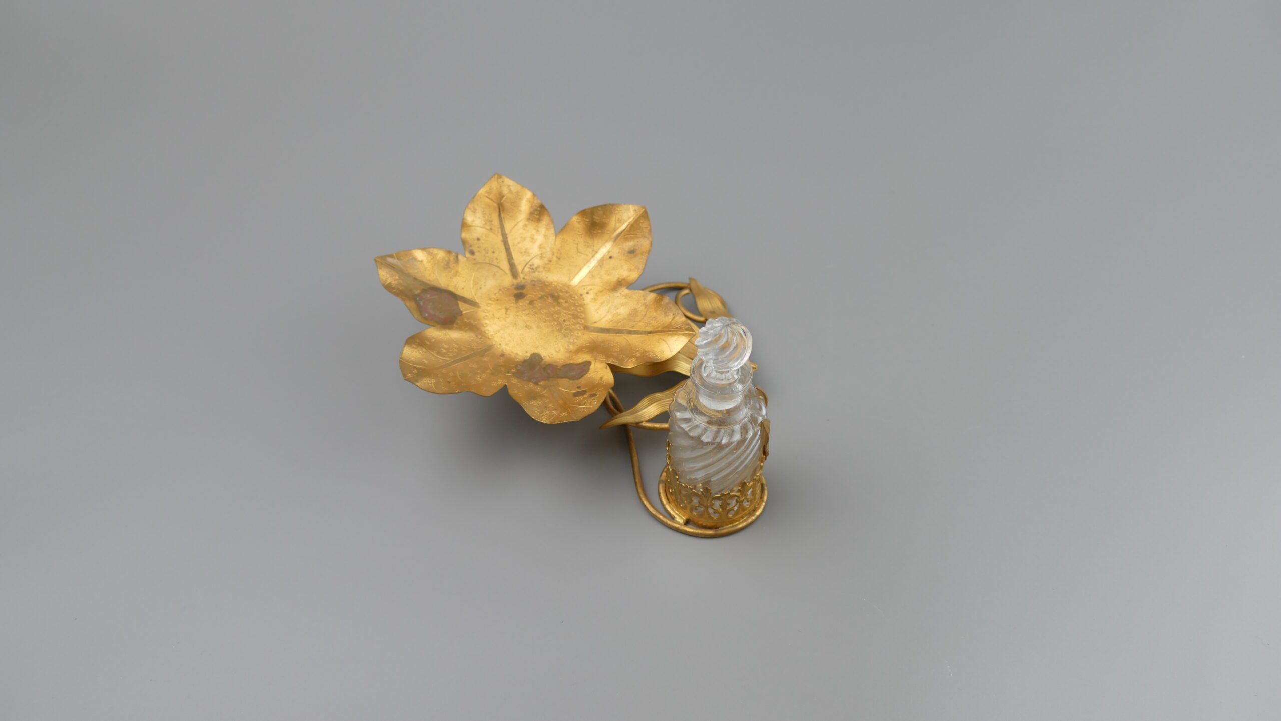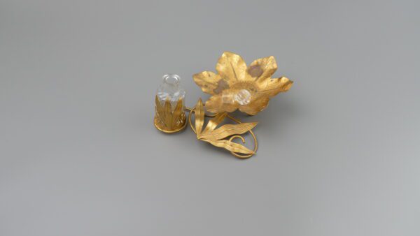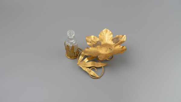 A charming vanity piece from an old Portuguese solar: a sculptural leaf-form dish in gilt metal (ormolu-style), paired with a crystal perfume bottle held in an ornate filigree mount. The naturalistic leaves and scrolling lines create a soft, romantic silhouette—perfect as a ring dish, trinket catch-all, or simply as a decorative accent on a console or dressing table.