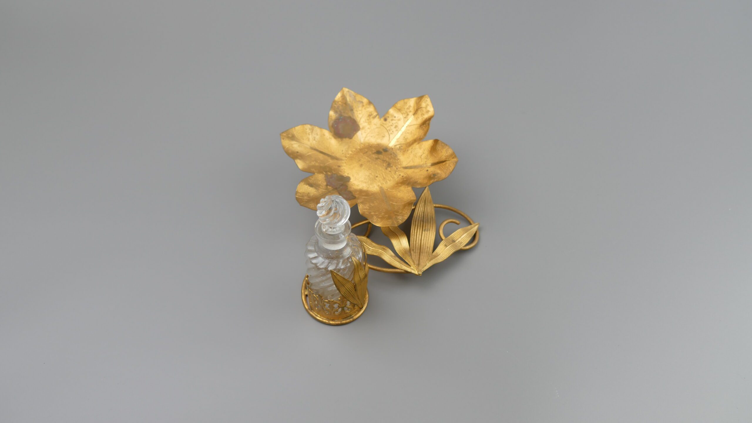 Probable period: While “around 1800” is sometimes stated for pieces like this, comparable French ormolu-mounted scent/vanity accessories are most commonly associated with the Second Empire (Napoleon III) into the Belle Époque, roughly the late 19th to early 20th century (c.1860–1910). This type of ornate gilt mount and vanity presentation appears frequently in documented late-19th-century French perfume sets and stands.