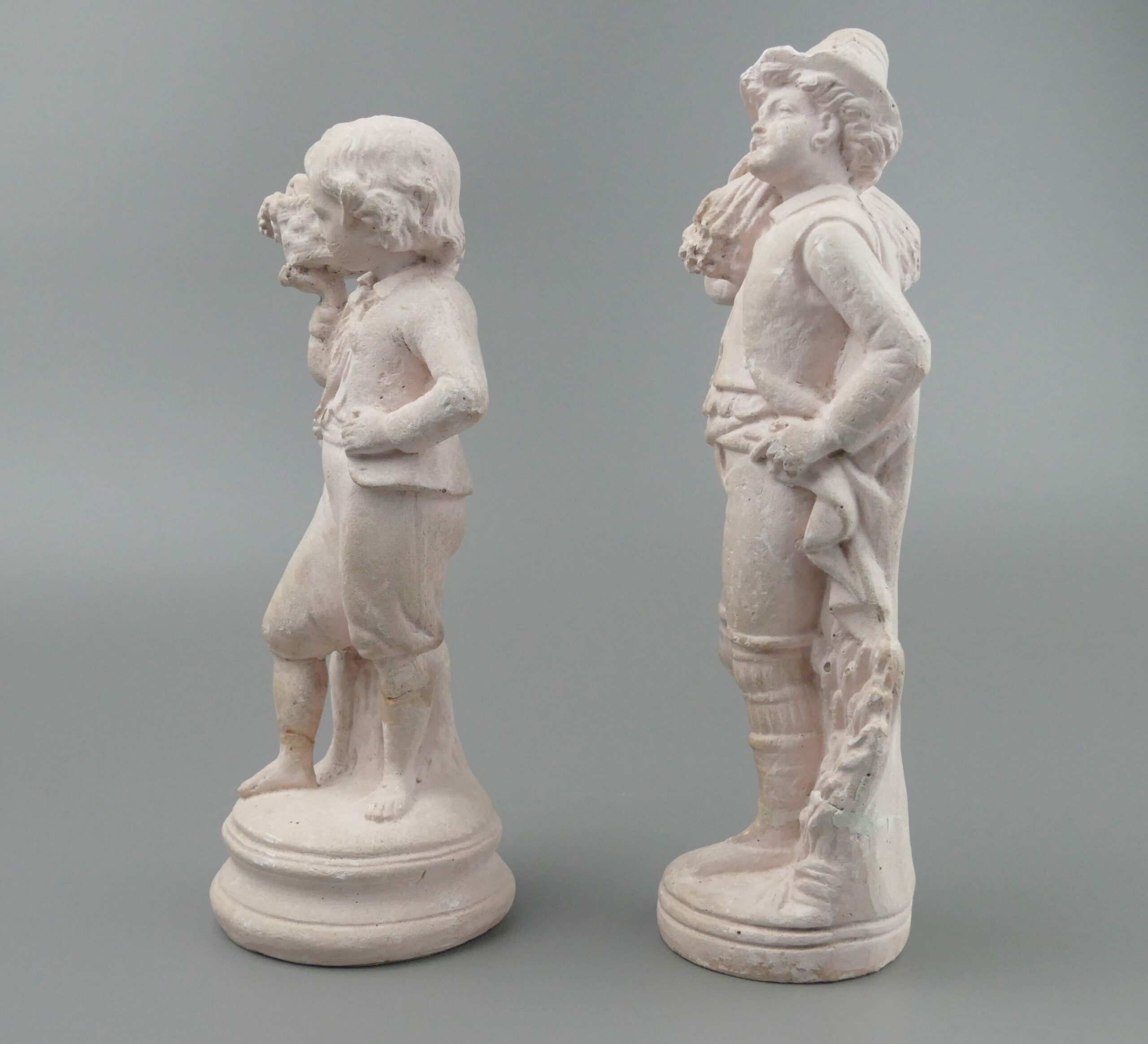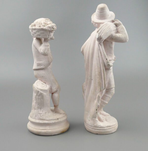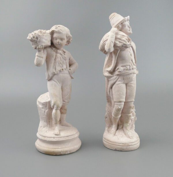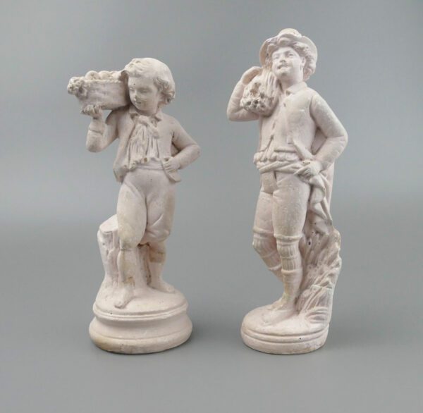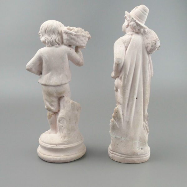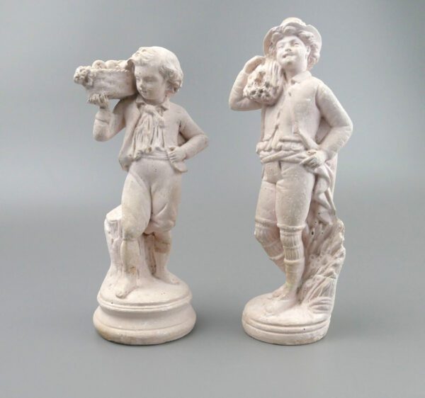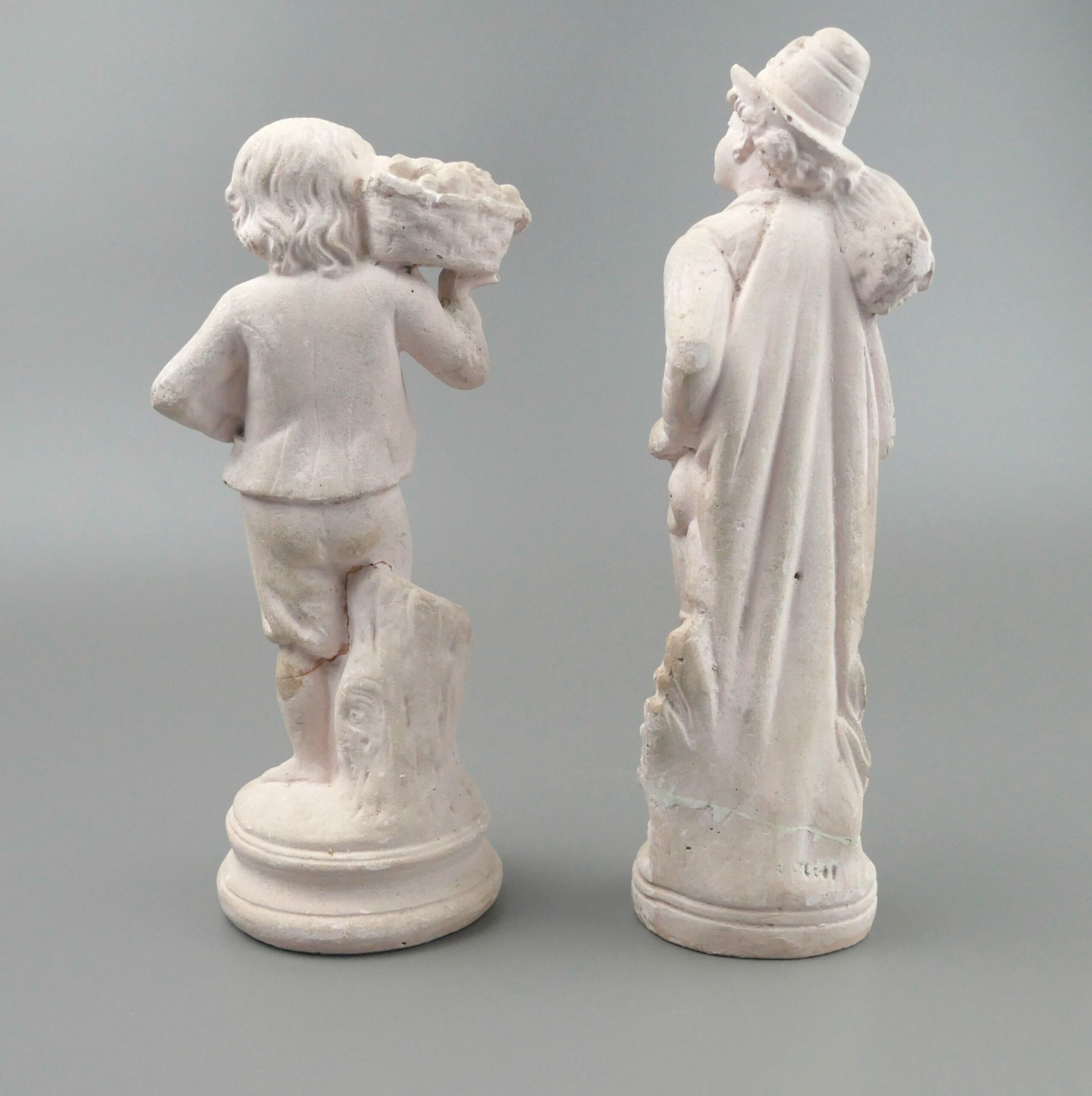 This attractive pair of vintage chalkware figurines captures a pastoral harvest theme: a young boy carrying a basket of fruit on his shoulder, and his companion holding a sheaf of wheat. With their soft, matte finish and classical styling, they make an evocative display on a mantelpiece, bookshelf, or in a kitchen or dining space—perfect for farmhouse, French country, Mediterranean and eclectic interiors.