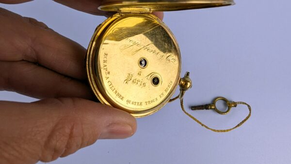Ladies’ key-wind pocket watch, Paris. Locket/hunter-style case in yellow metal (appears gold; fineness untested/unguaranteed) with starburst engraving. White enamel dial with Roman numerals; one hand is broken and the watch does not run. Inside is French text consistent with a cylinder escapement: “Échappement à cylindre – quatre trous en rubis – Paris” and the name Lavoye Frères. Original winding key included.