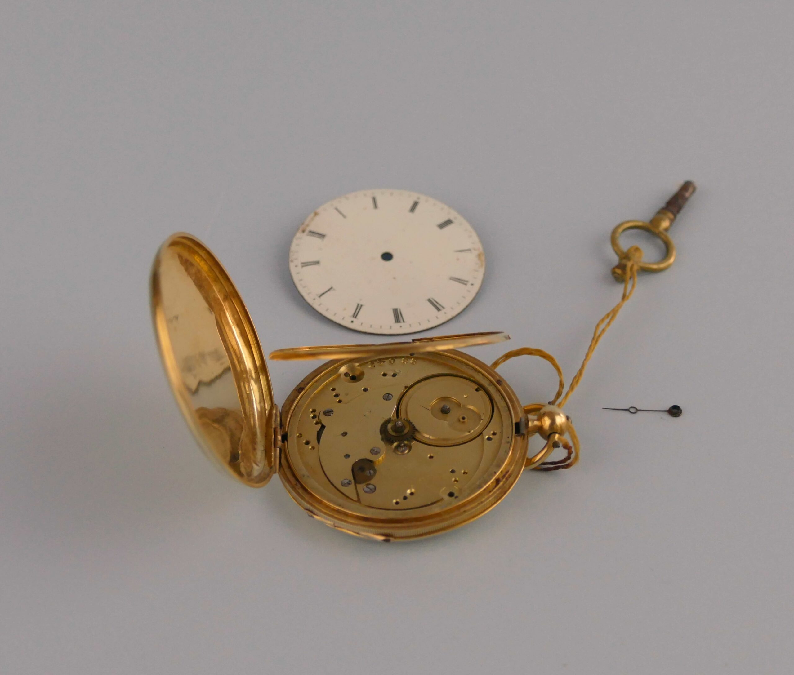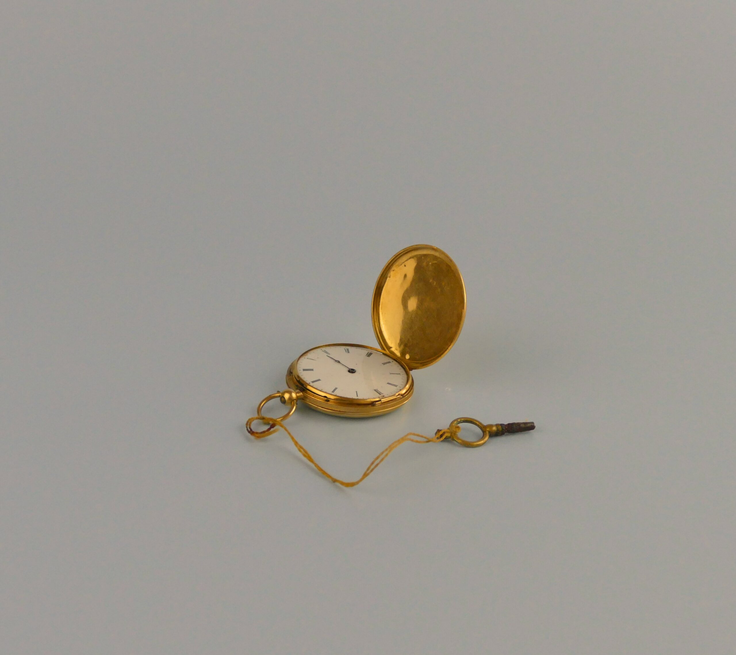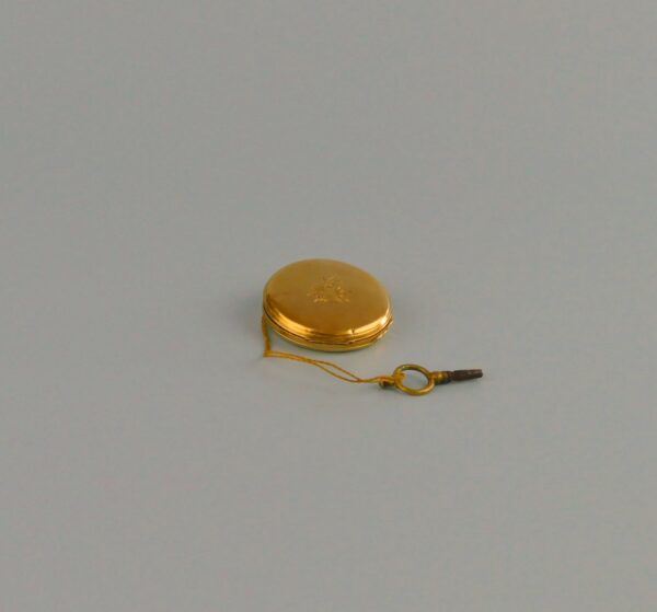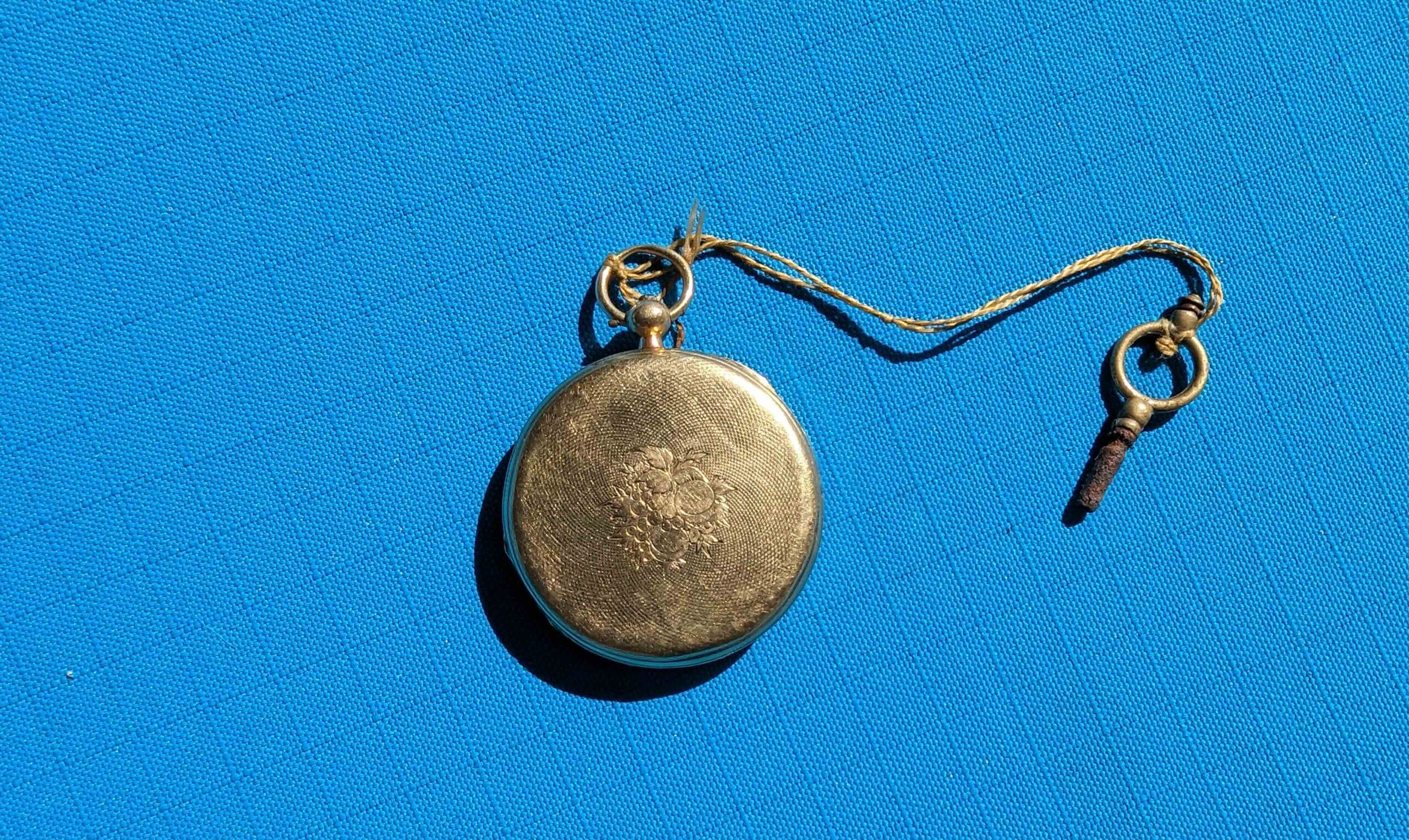 Paris ladies’ key-wind pocket watch, non-working; broken hand. Yellow-metal locket case (gold appearance, untested). Key included.
