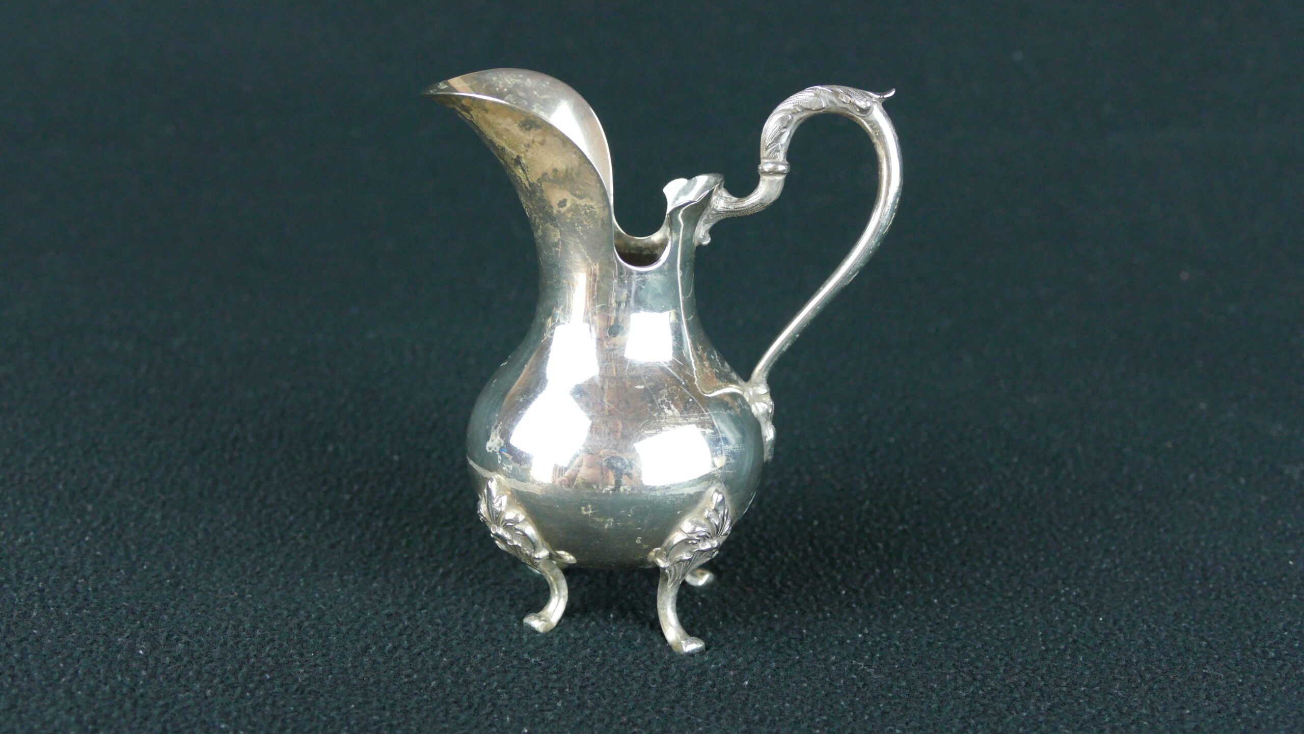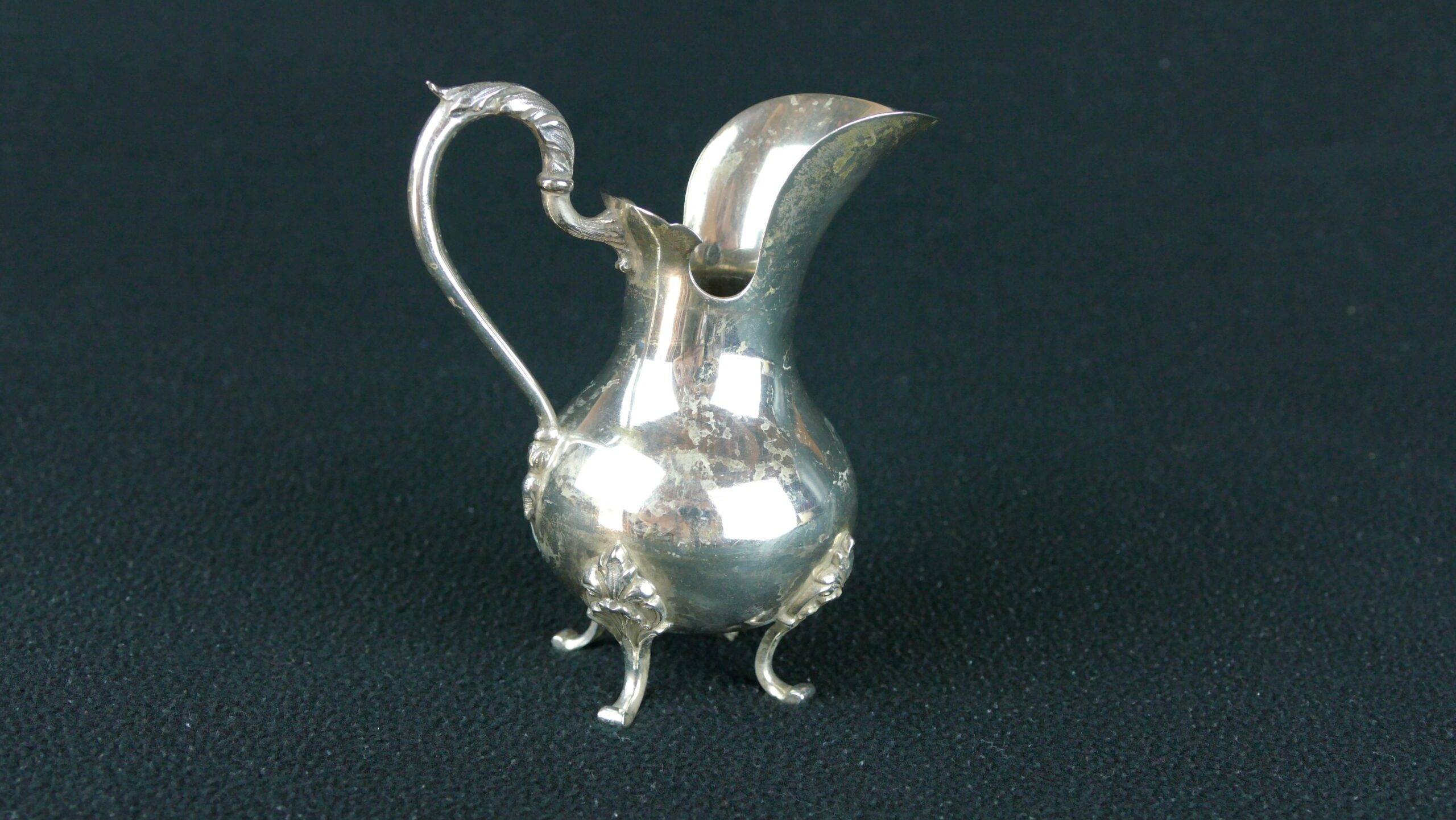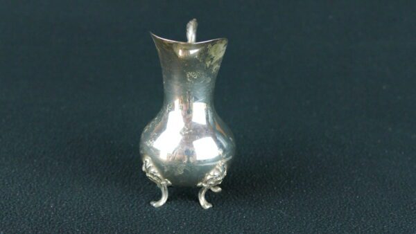 This delightful Portuguese .833 silver creamer (leiteira) has all the elegance of turn-of-the-century table silver: a rounded, bulbous body with a generous pouring lip, a high sweeping handle, and three small feet enriched with vegetalist/foliate appliqués. It’s the sort of refined, compact piece that would have sat beside a tea service for serving milk or cream, while still looking beautiful displayed on a tray or bar cart.