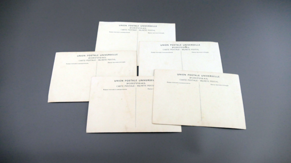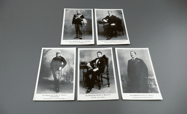This rare group of five original Portuguese postal cards (“Union Postale Universelle – Portugal / Carte Postale / Bilhete Postal”) features crisp black-and-white photographic portraits of the Portuguese royal family, dated 1905 and 1908—right at the end of Portugal’s monarchy.
