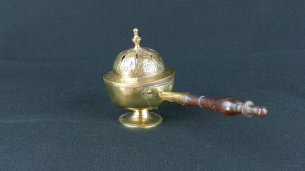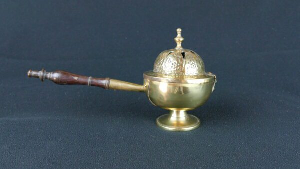A characterful brass incense burner with a pierced domed lid and turned wooden handle, sourced from a Portuguese Solar. Designed for charcoal tablets and resin incense, the rounded bowl sits on a small pedestal foot while the vented dome encourages a gentle, fragrant draw and helps contain ash.