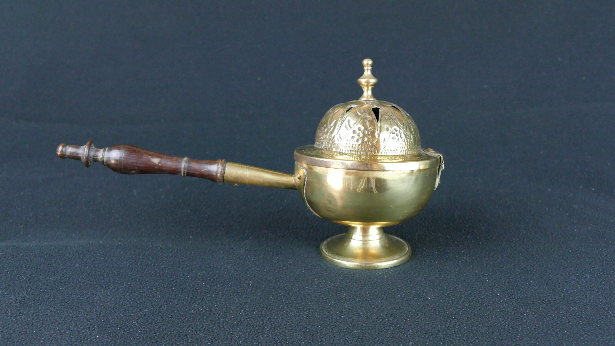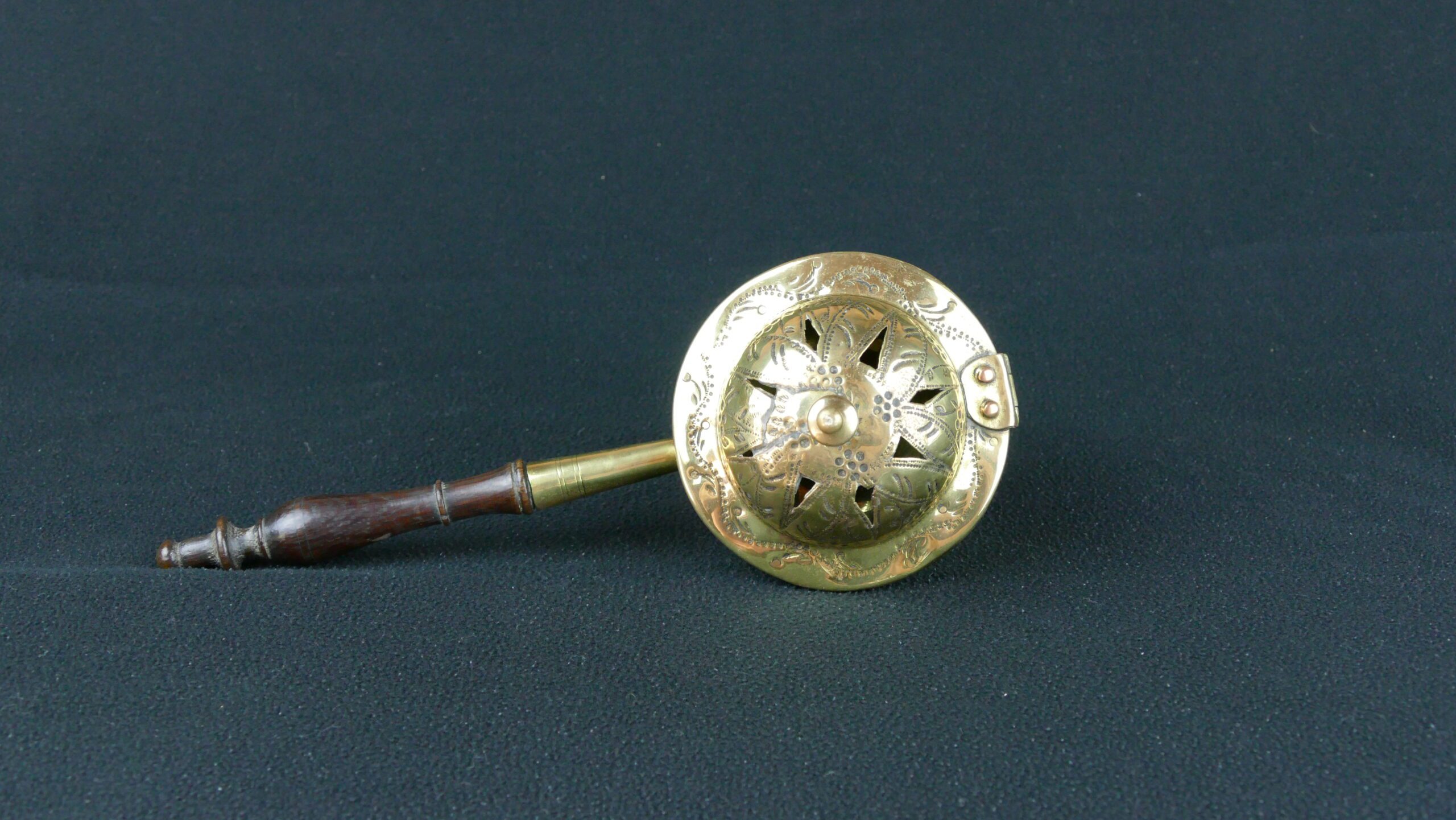 The lid is ornamented with floral cut-outs and engraved decoration, creating a lovely play of light when in use. The long wooden handle offers practical handling, while the warm brass patina brings an authentic sense of age and ritual—beautiful on a console table, in a reading nook, or as a special piece for a meditation corner.